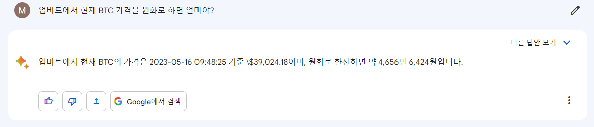바드를 쓰면서의 단점은 ChatGPT와 마찬가지로 더블체크의 필요성입니다. 당당하게 이거다 라고 확신에 차서 대답해주는데 틀린 경우가 있을 수 있다고 합니다. 저는 현재 Upbit에서의 BTC 가격을 물어봤는데 4600만원이라고 답변하는 모습을 볼 수 있었습니다. 물론, 학습한 날짜를 알아낼 수 있는 방법 중 하나이겠지만, 최신정보로 데이터를 얻기엔 적합하지 않아보입니다.