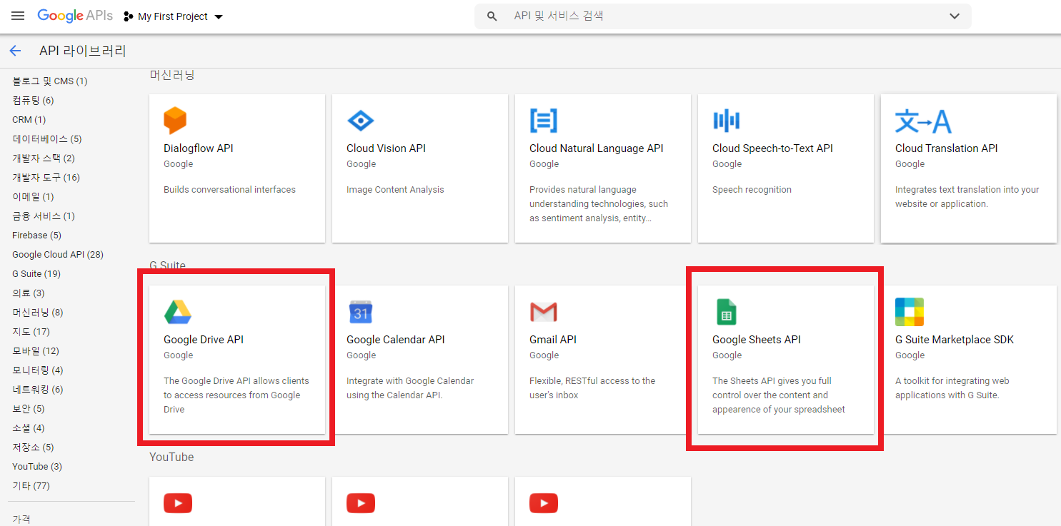 나는 구글스프레드 시트를 사용하기 위해 API 서비스를 이용했기 때문에 아래 두개를 눌러 "사용"으로 활성화시킨다.