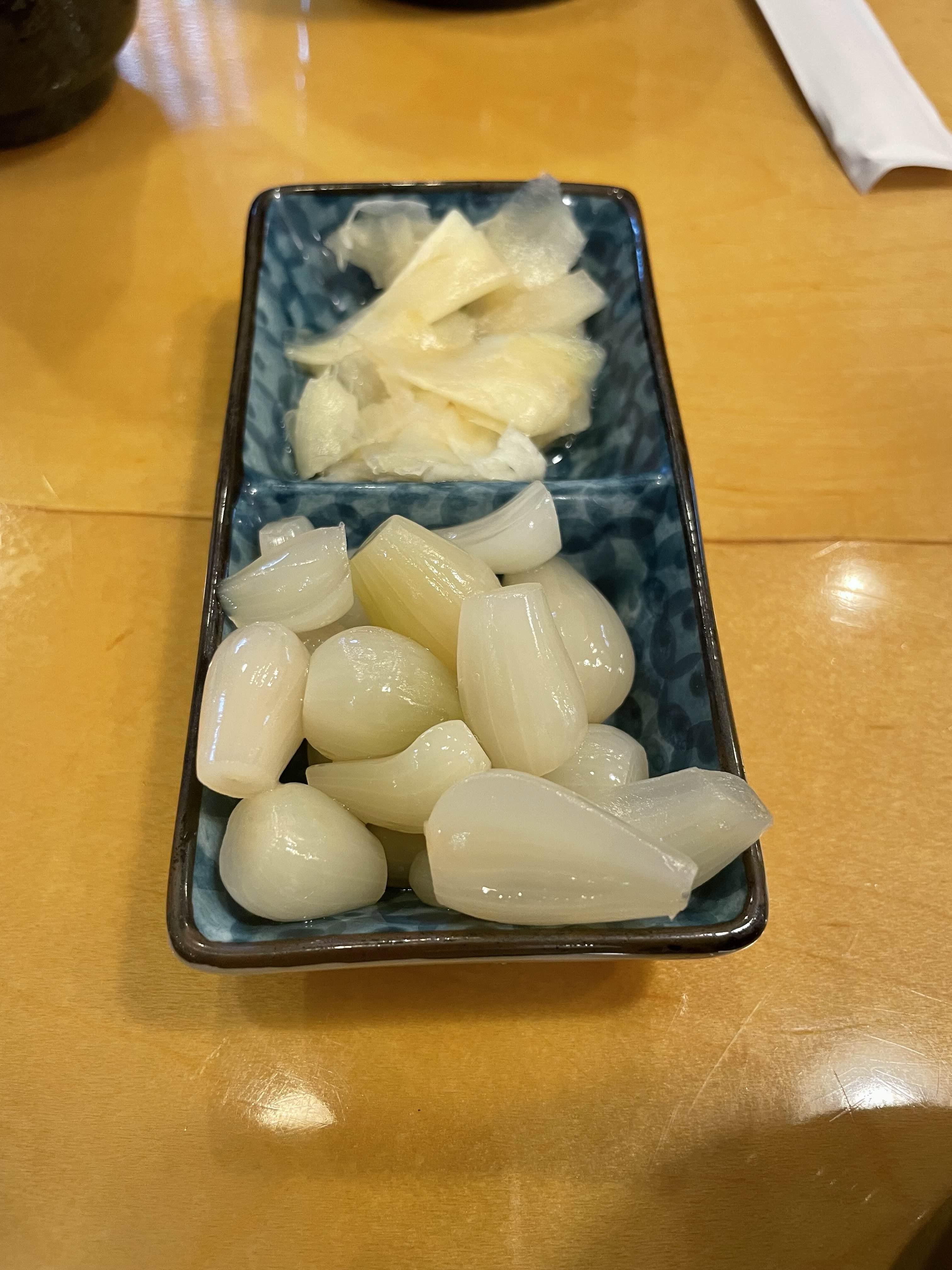 기본적인 장국과 락교.