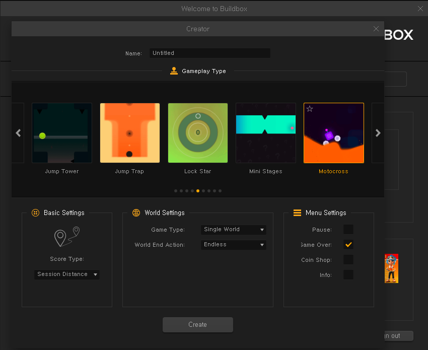 Motocross를 선택한 후 Create를 눌러 시작합니다.