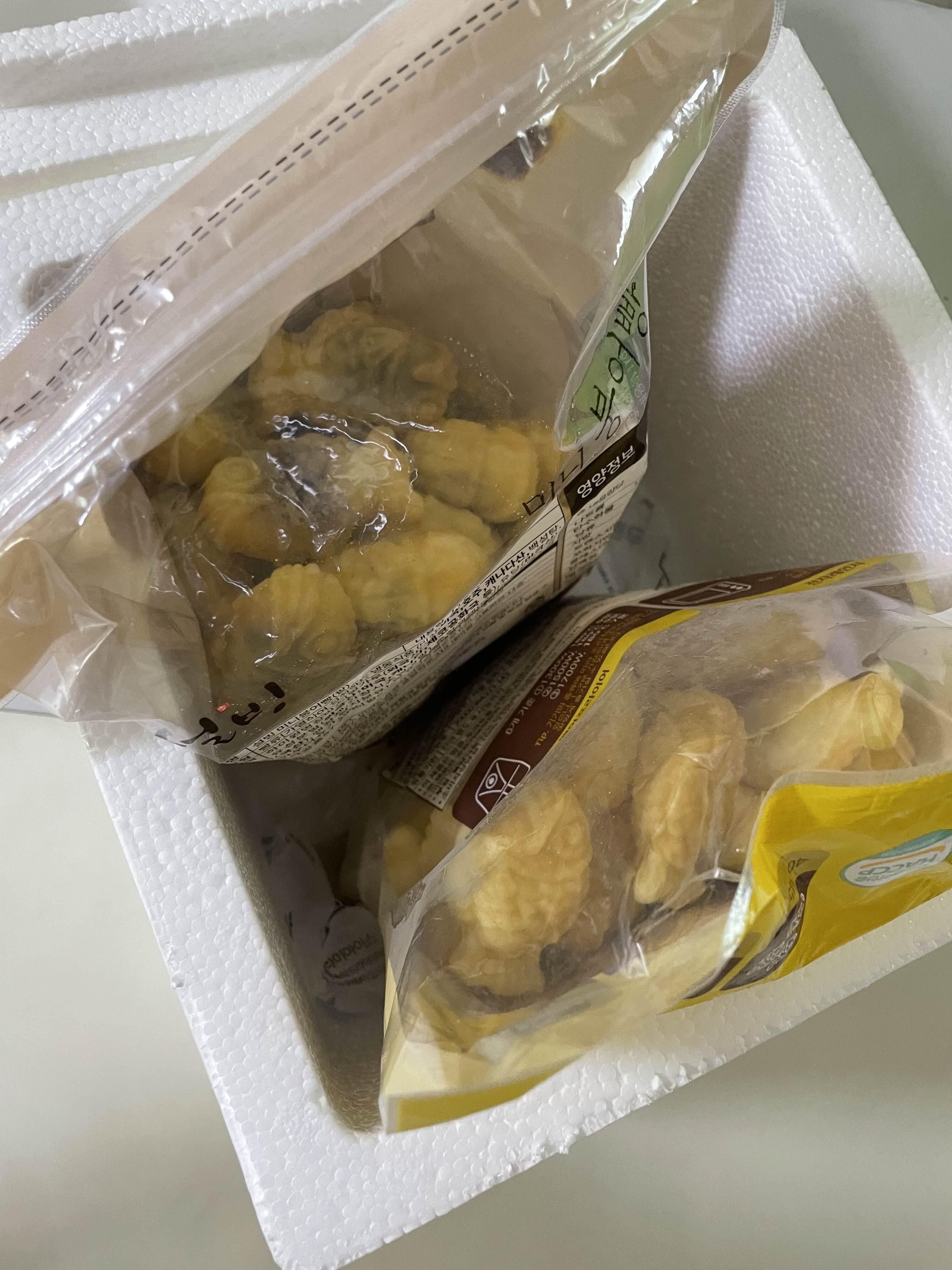 냉동식품이라 스티로폼안에 얼음팩과 함께 배송되었다. 속이 까맣게 보이는건 팥 걍 노로스름한건 슈크림!