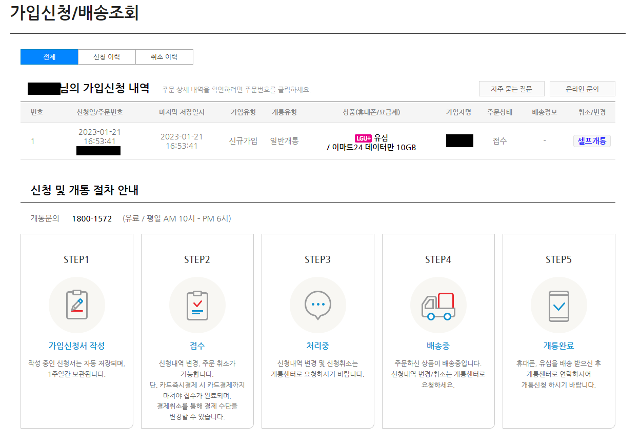 아래와 같이 셀프개통이라고 되어 있는데요. 주문상태가 접수로 되어 있습니다.