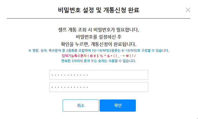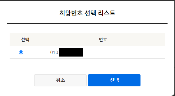 여기서 셀프개통을 눌러서 추가진행을 하면, 바로 개통을 시킬 수 있습니다. 가입신청시에 적은 희망번호를 기준으로 희망번호 선택 리스트가 생기게 되는데요. 이걸 선택해서 진행합니다. 그 뒤로 셀프개통 조회 비밀번호 입력 후 저장하면 셀프개통 진행이 끝나게 됩니다.