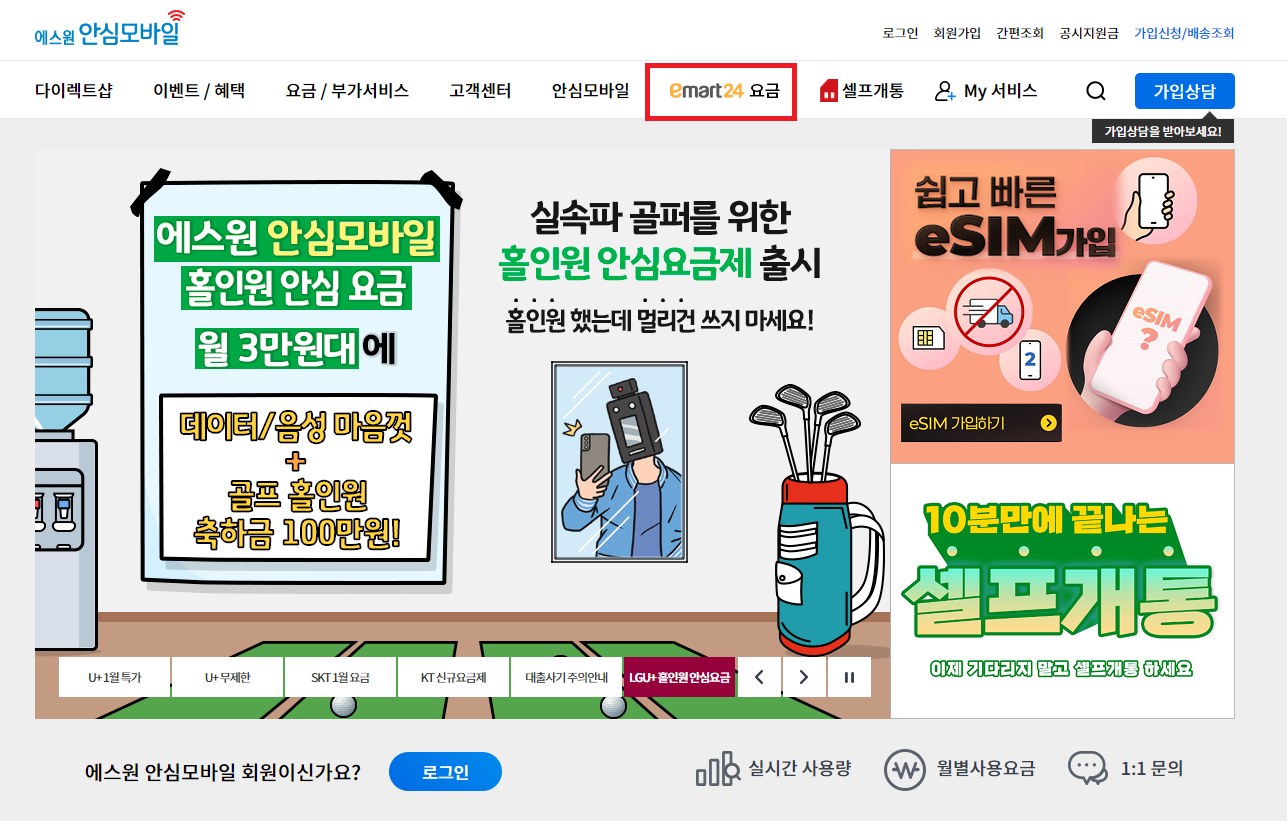 에스원 안심모바일 홈페이지로 이동합니다. 여기서 emart24 요금을 선택합니다.