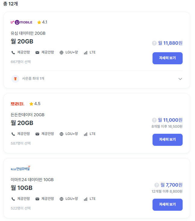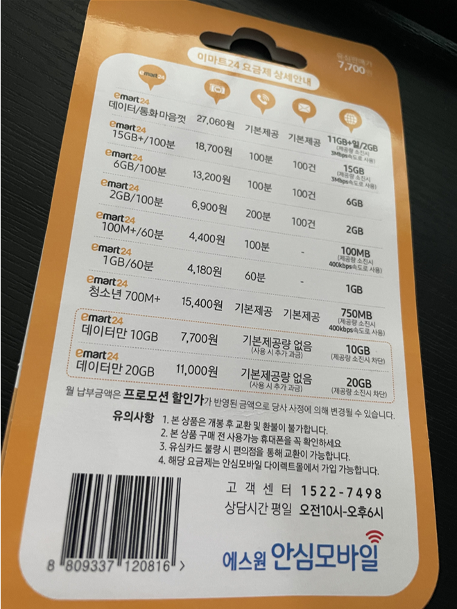 이마트24 데이터만 10GB로 12개월동안 7700원이고, 그 뒤로 8800원입니다. 지난주까지만하더라도 7700원이었는데 1100원 늘어난 기분이네요.