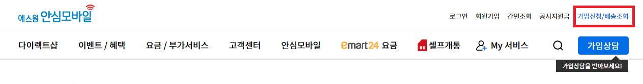 가입이 완료되면 비밀번호 입력까지 다 했을텐데요. 이제 다시 에스원 안심모바일 홈페이지로 넘어와서 가입신청/배송조회를 눌러서 확인합니다.