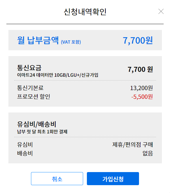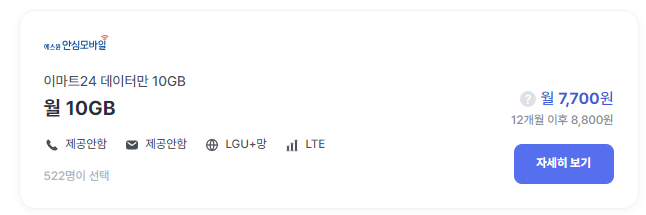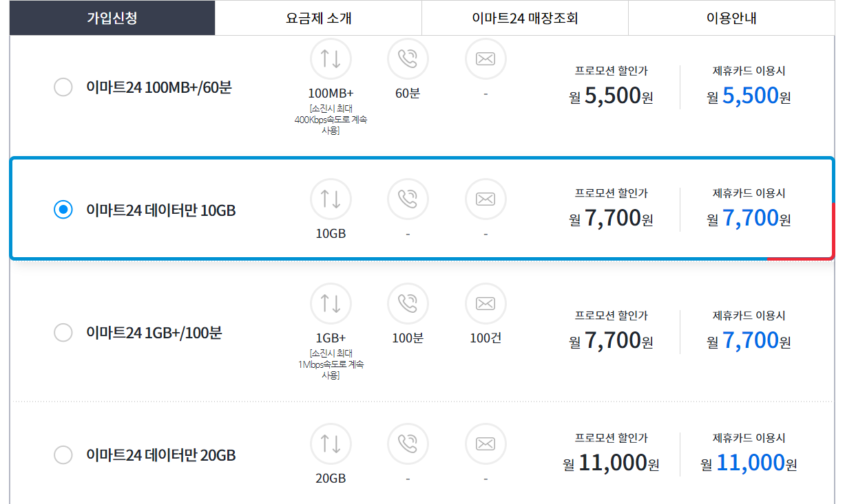그 중 가장 저렴한 10G에 7700원짜리 요금제를 찾았습니다. 이마트24에서 나온 요금제인데요.