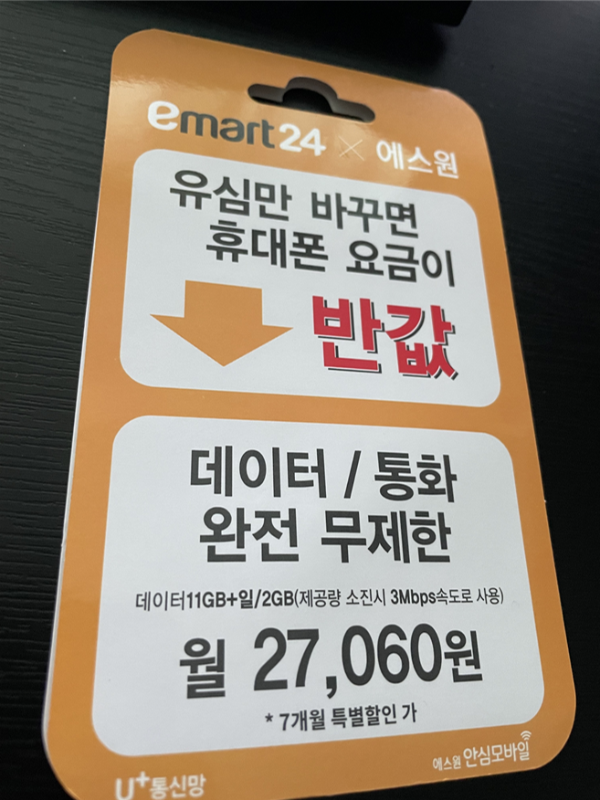 VAT 포함 월 7700원으로, 이마트24 데이터만 10GB/LGU+/신규가입으로 가입했습니다. 유심은 이마트24에 가서 아래와 같은 유심을 사면됩니다. 이마트24 여러군데를 다녔는데 있는 곳이 몇군데 없으니 미리 전화하고 가시면 헛걸음하지 않을 수 있습니다.