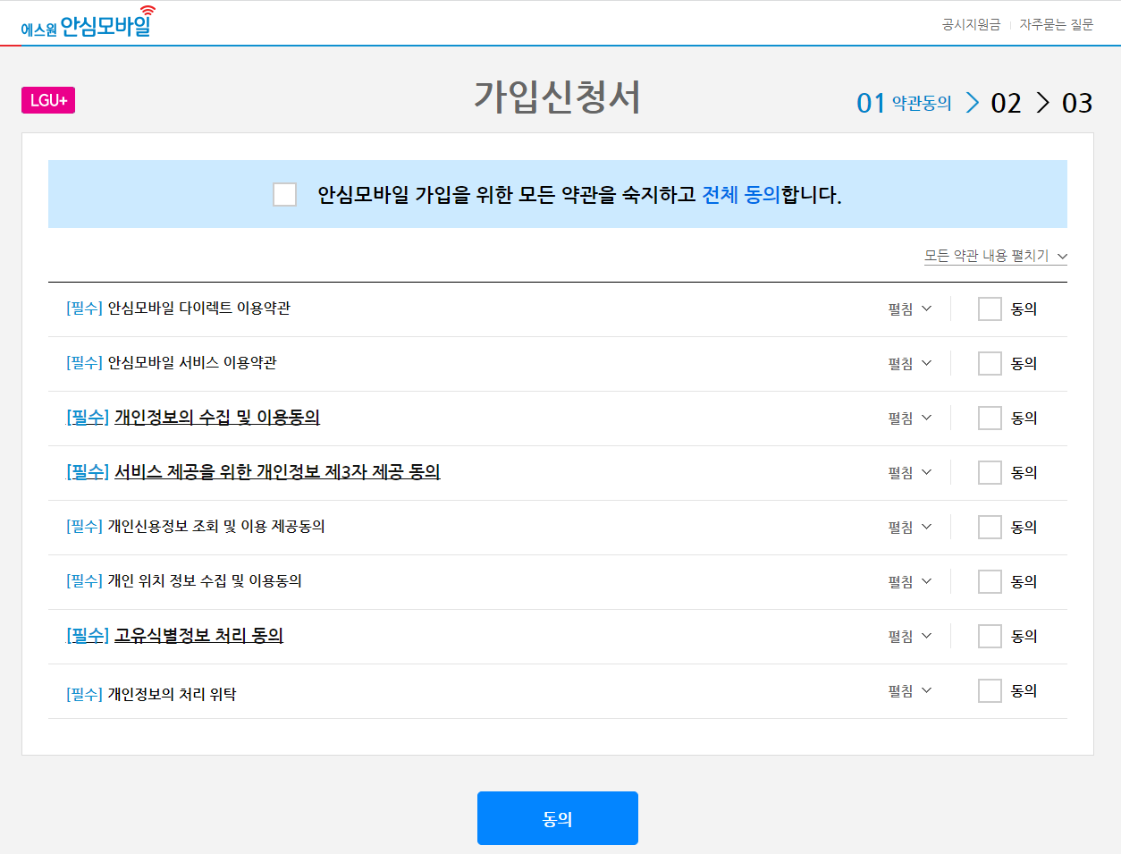 약관을 읽어보고 가입하면 됩니다. 가입 신청서에는 기본적인 본인/실명인증과 유심사용할 휴대폰 정보 등을 입력합니다.