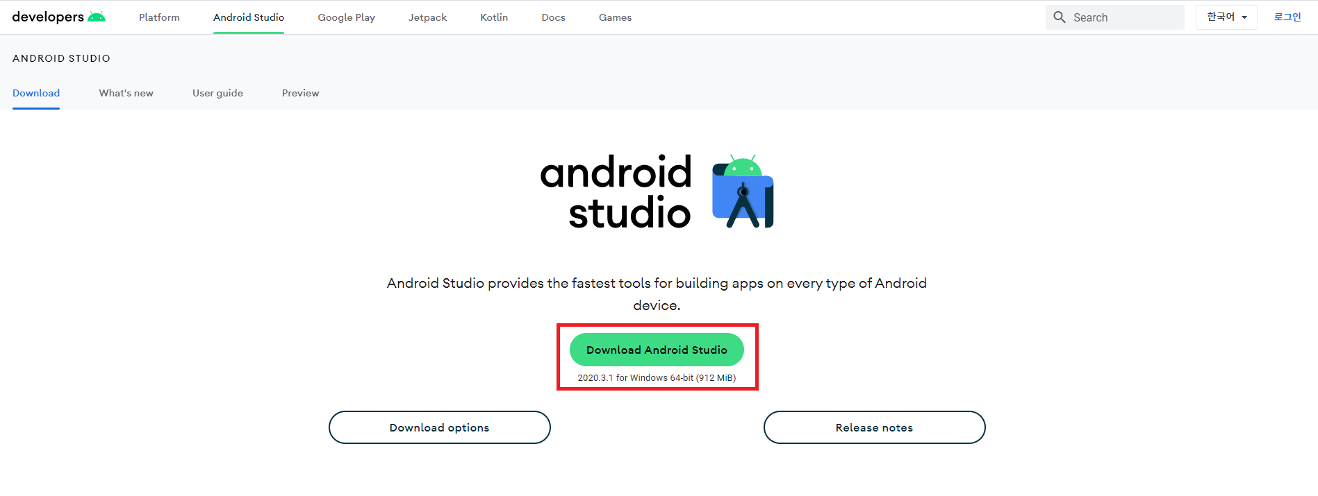 Download Android Studio를 클릭해서 다운 받습니다.