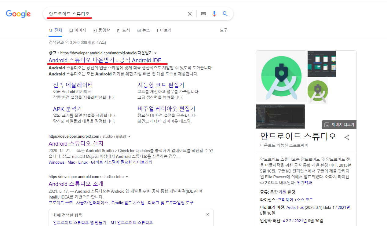 먼저 구글에 안드로이드 스튜디오라고 검색합니다.