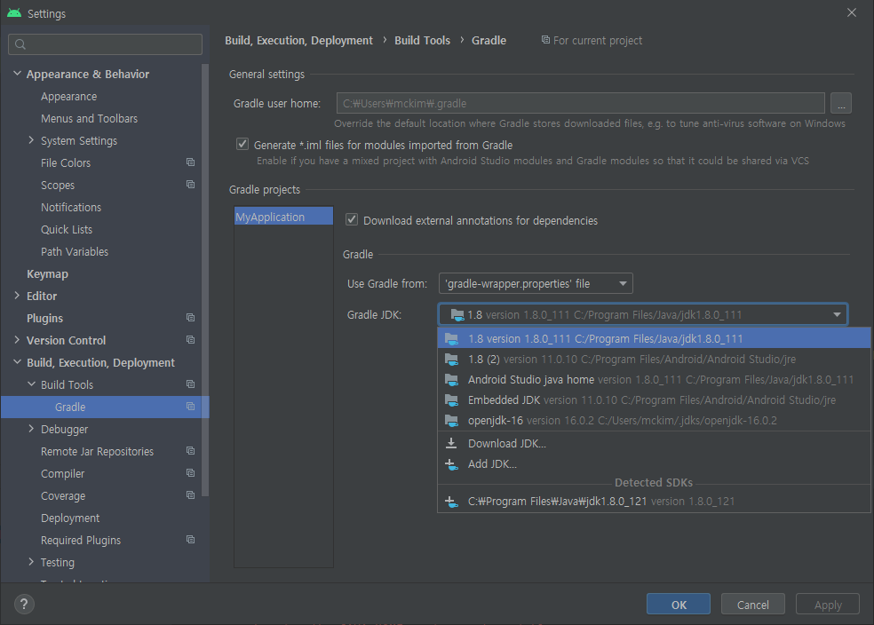 File에서 Settings에 들어오면 아래와 같이 Build, Execution, Deployment, Build Tools, Gradle을 누르면 아래 화면이 나옵니다.