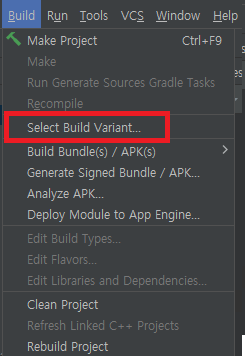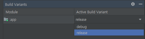 Build 탭의 Select Build Variant... 를 선택하면 app의 debug와 release를 선택할 수 있습니다.