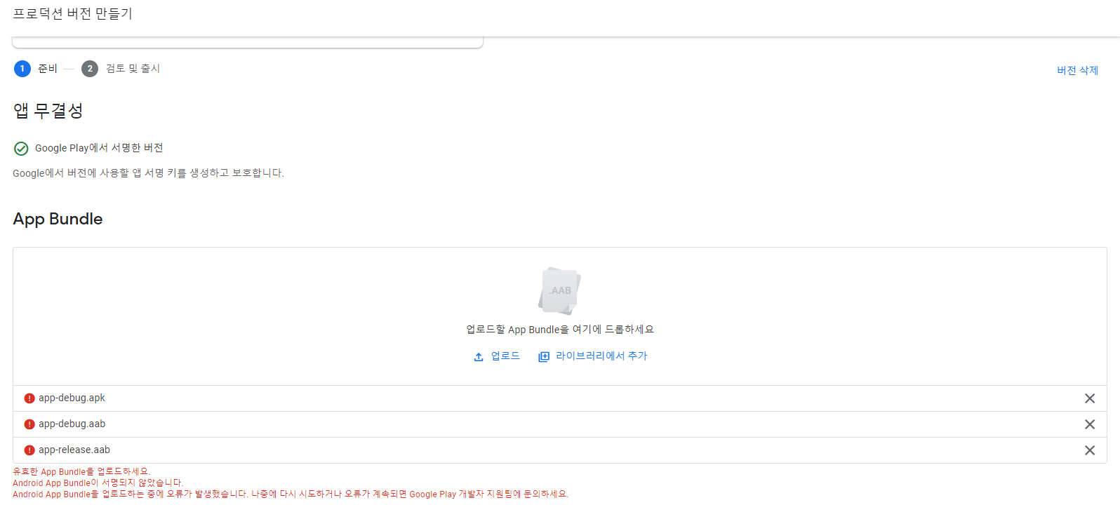 "Android App Bundle이 서명되지 않았습니다.""유효한 App Bundle을 업로드하세요."