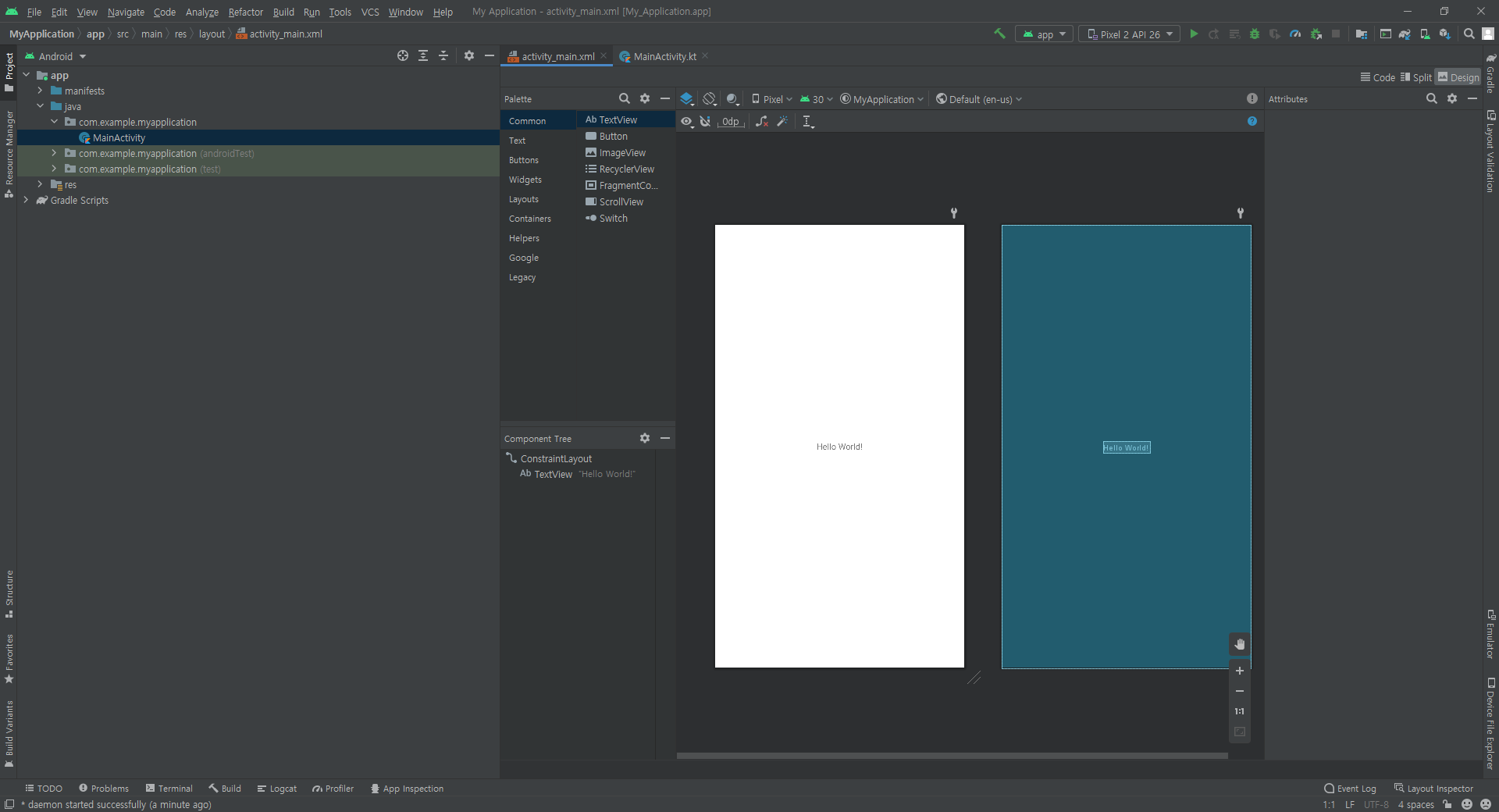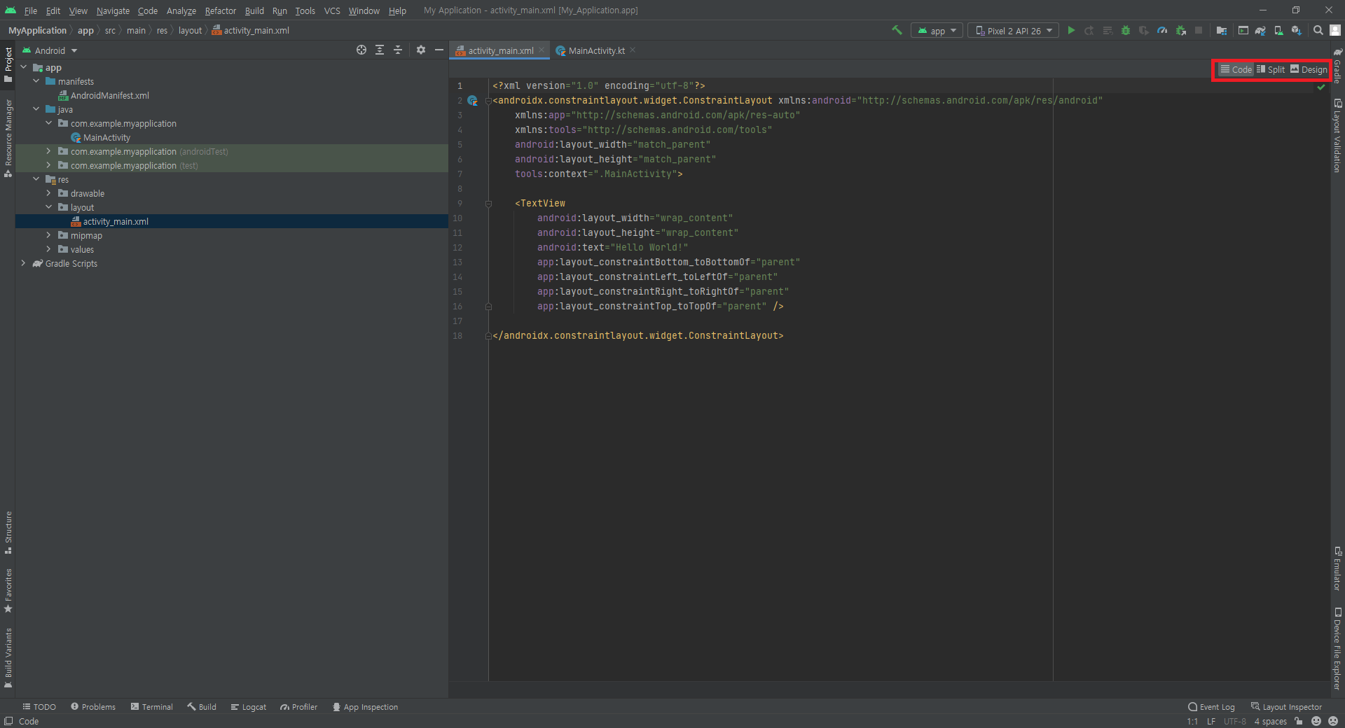 "Hello, World!"가 중앙에 있지요. 이 Hello World라는 텍스트는 위의 코드에 있는바와 같이 TextView 라는 걸로 생성되어 있는걸 볼 수 있습니다.