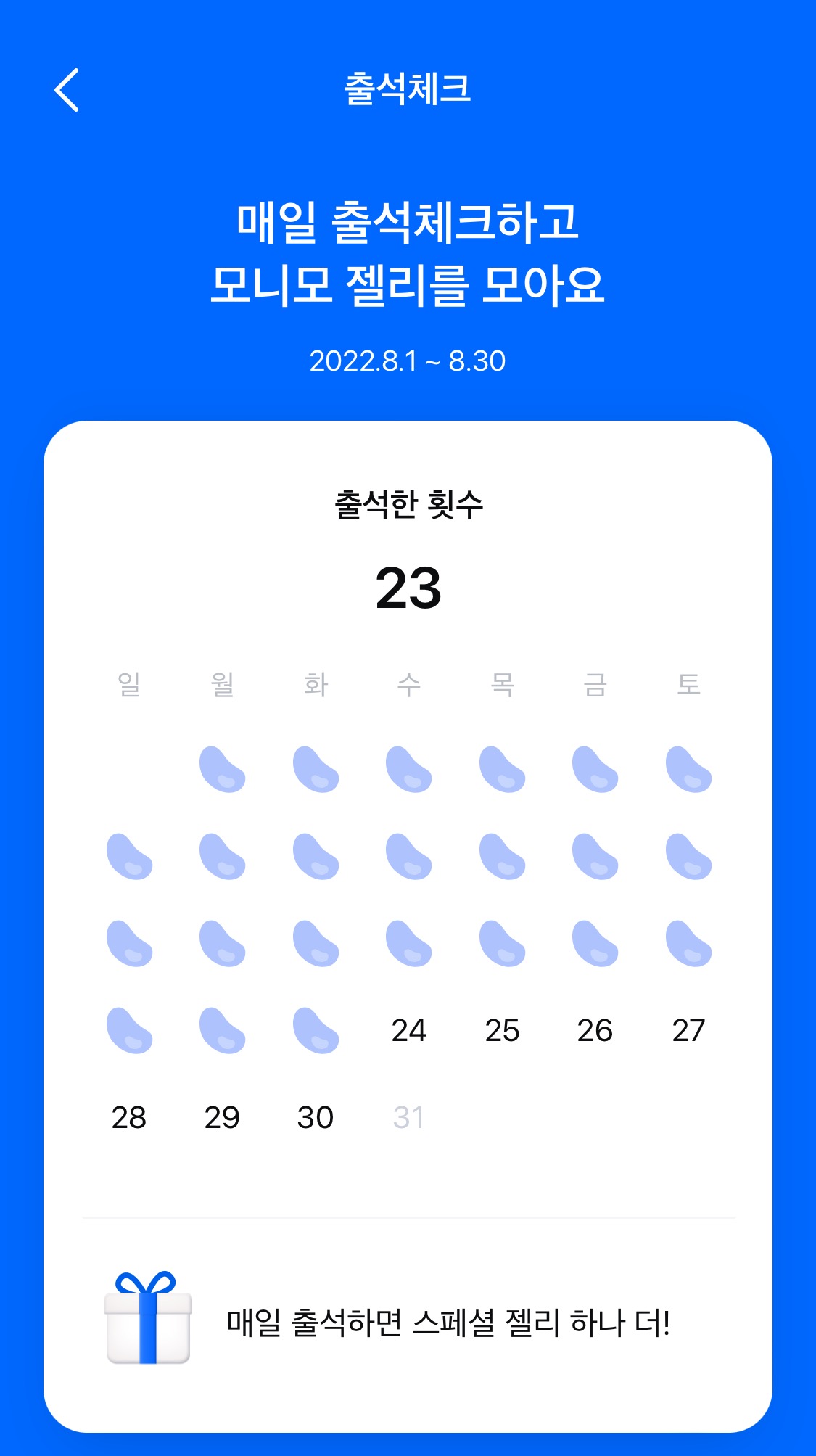 8월의 경우 8.1-30 까지 모두 출석하면 스페셜젤리를 얻을 수 있습니다. 특별히 이 미션의 경우에는 출석보충의 기회를 주기 때문에 크게 며칠동안 까먹지 않는이상 달성할 확률이 높습니다.