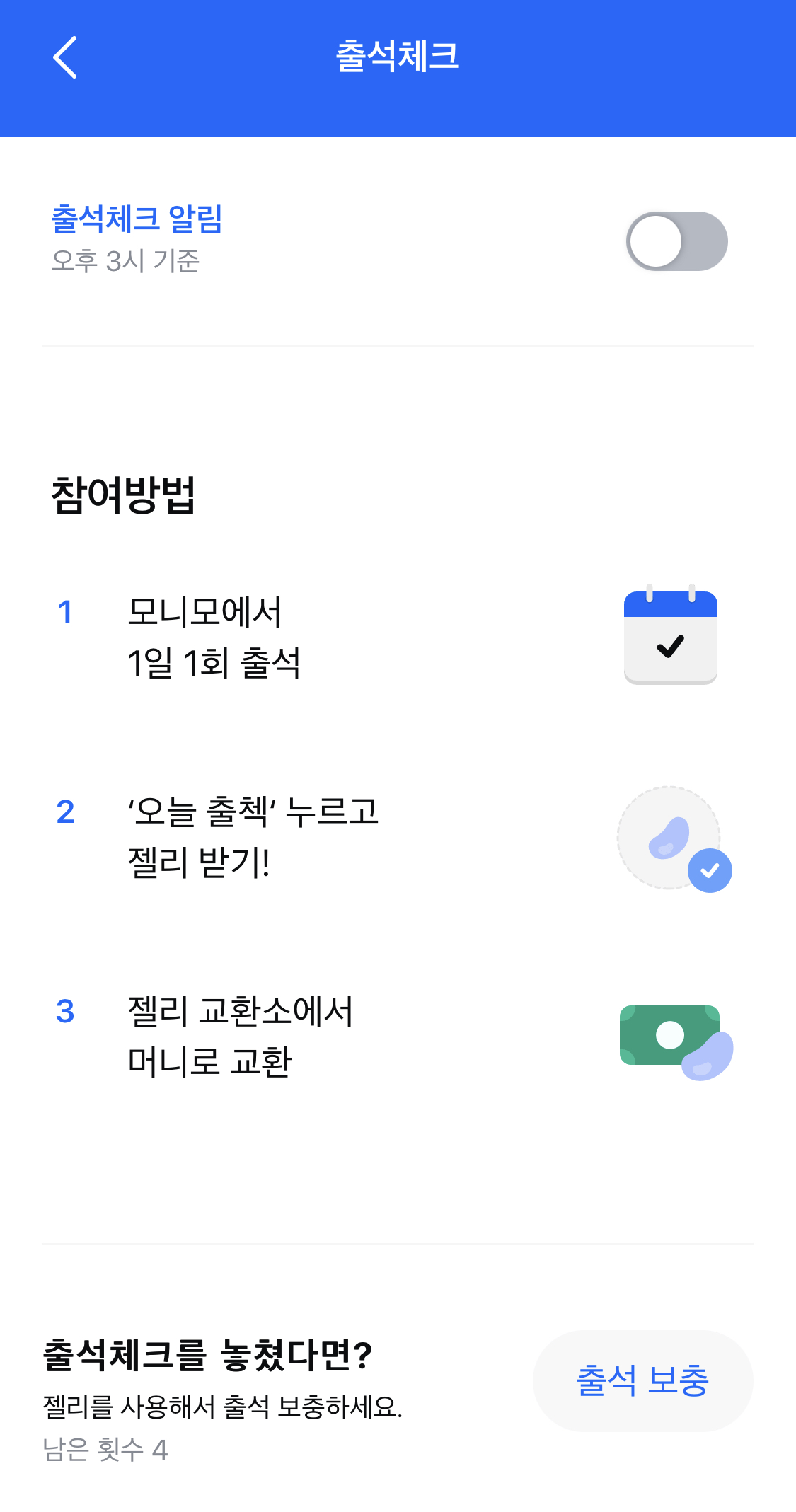 가장 쉬우면서 까먹기 쉬운 미션입니다. 바로 출석체크인데요. 하루에 한번씩 누르면 젤리 한개씩을 얻을 수 있습니다.