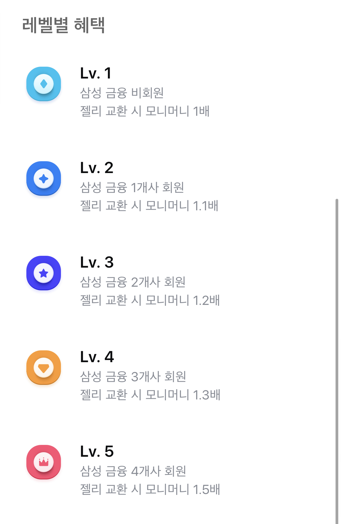 각각의 젤리는 모니머니라는 포인트로 랜덤하게 바뀌게 되는데 그냥 랜덤으로 나온 값으로만 받는게 아니라 내 계정의 레벨에 따라 곱해서 받게됩니다.