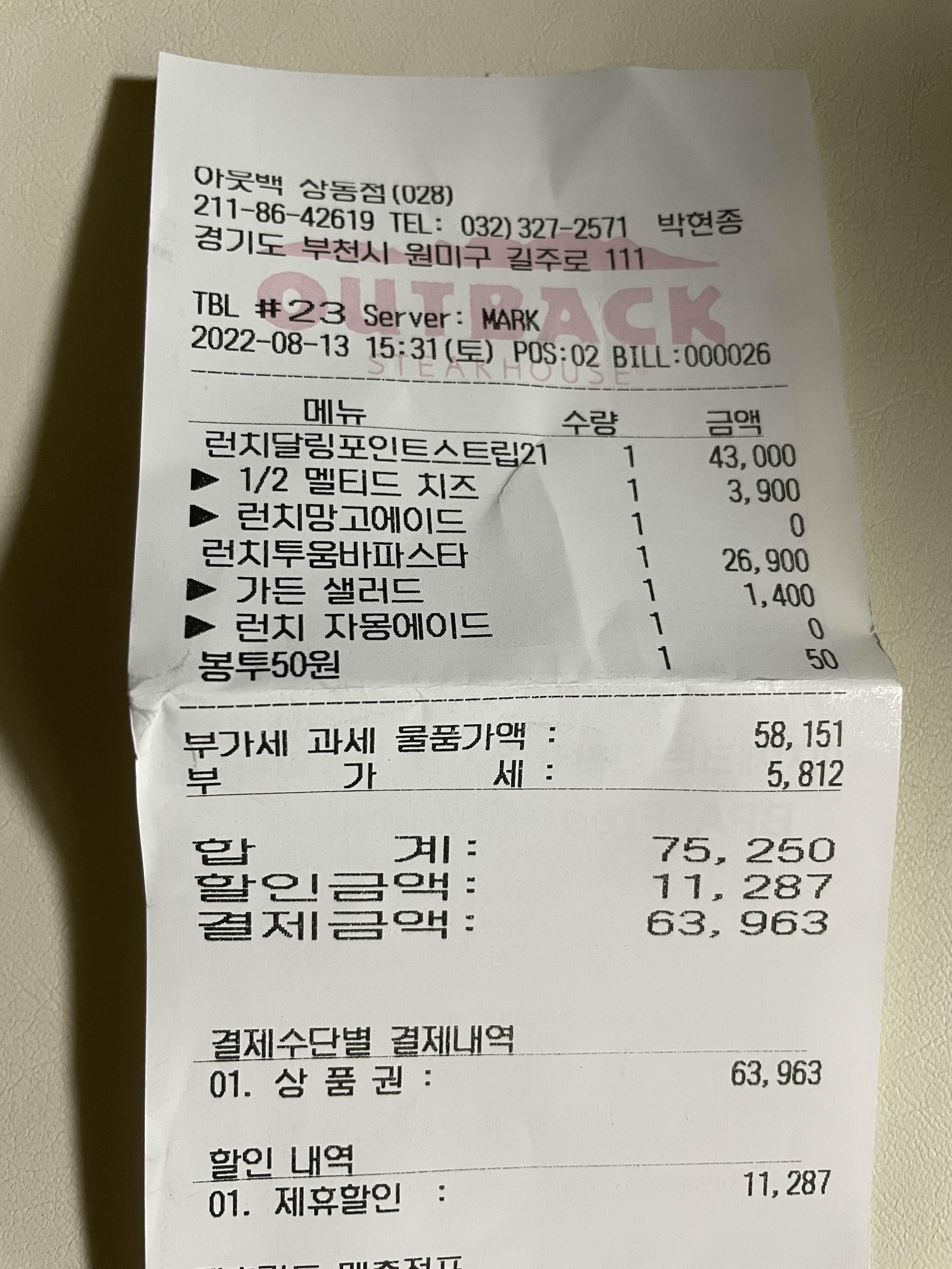 할인은 sk멤버십(골드이상)으로 15%를 받았다.