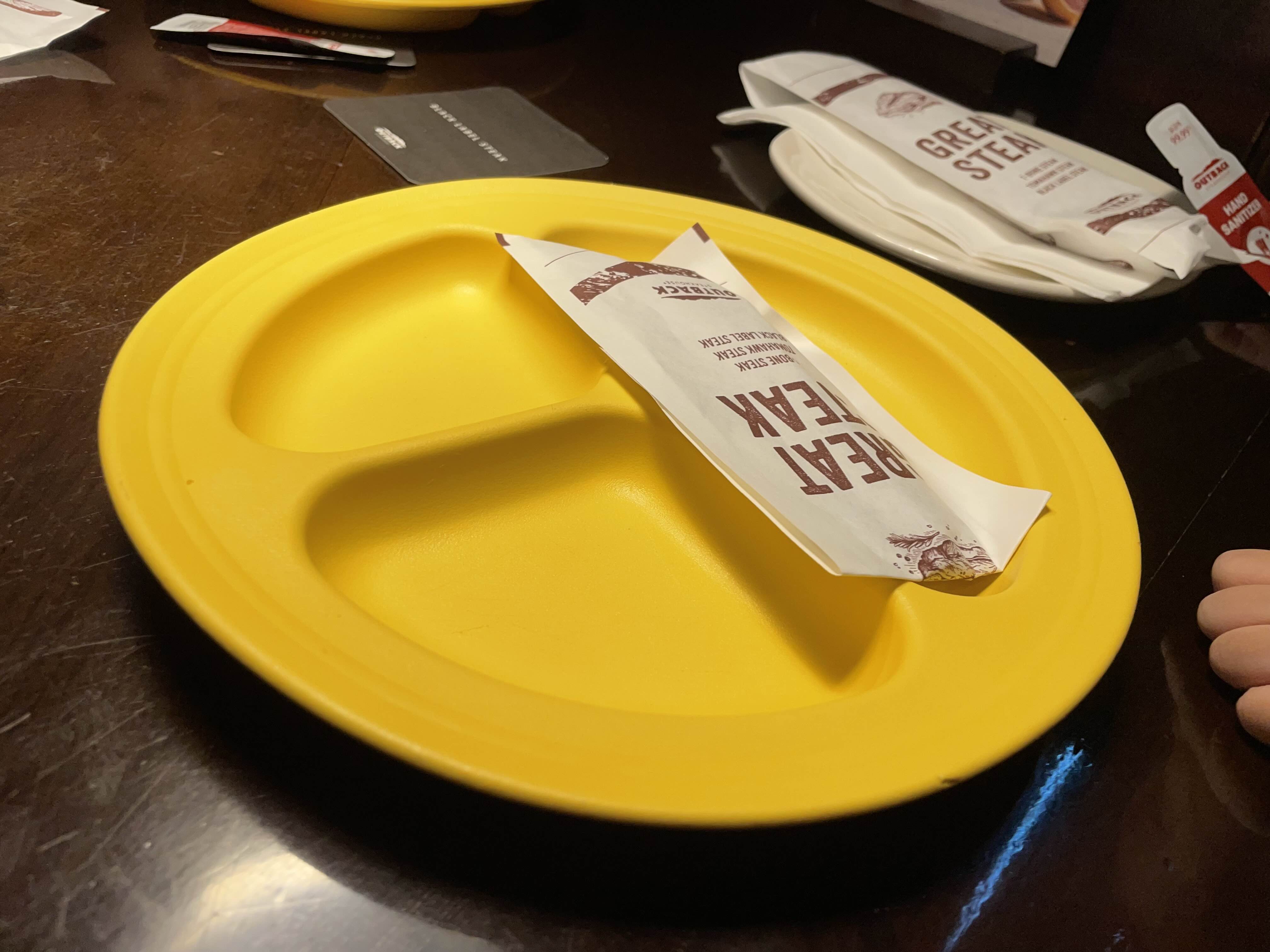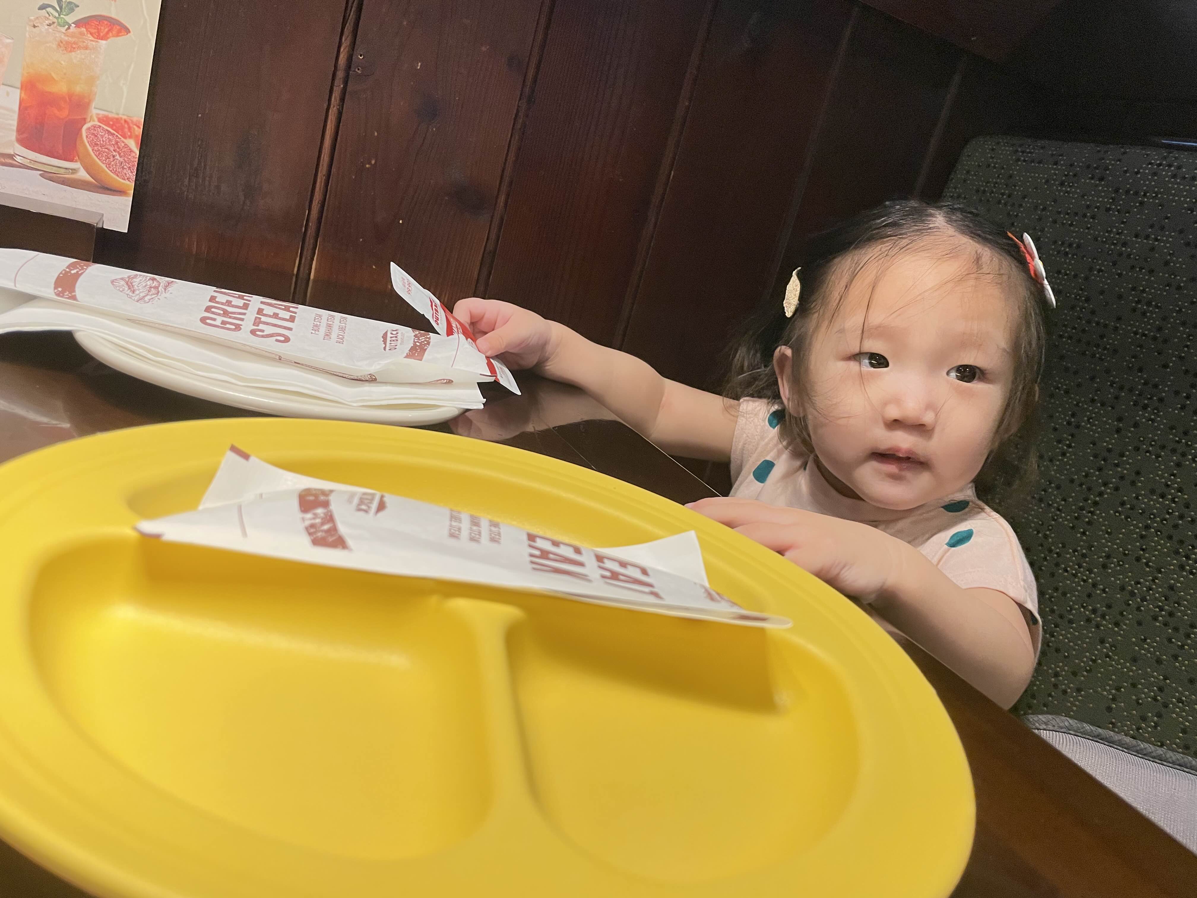 그리고 애기용 접시를 준비해준다. 두명이라 두개 준비요청. 노란색의 식판과 작은 수저를 준비해주었다.