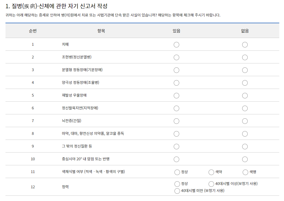 만약 시력이 0.5 이상이 되지 않는다면 부적격으로 직접 가서 적성검사를 받아야합니다.