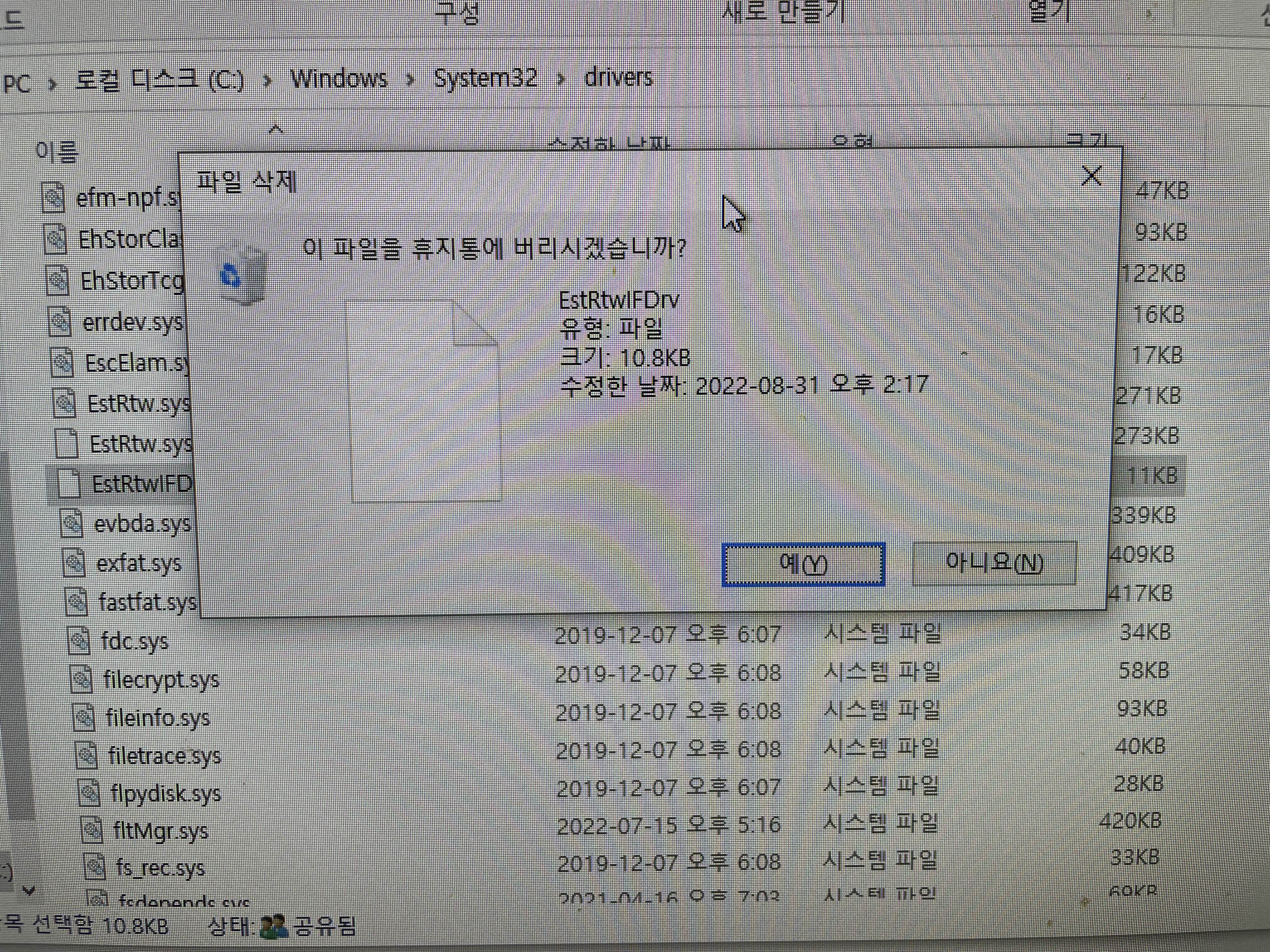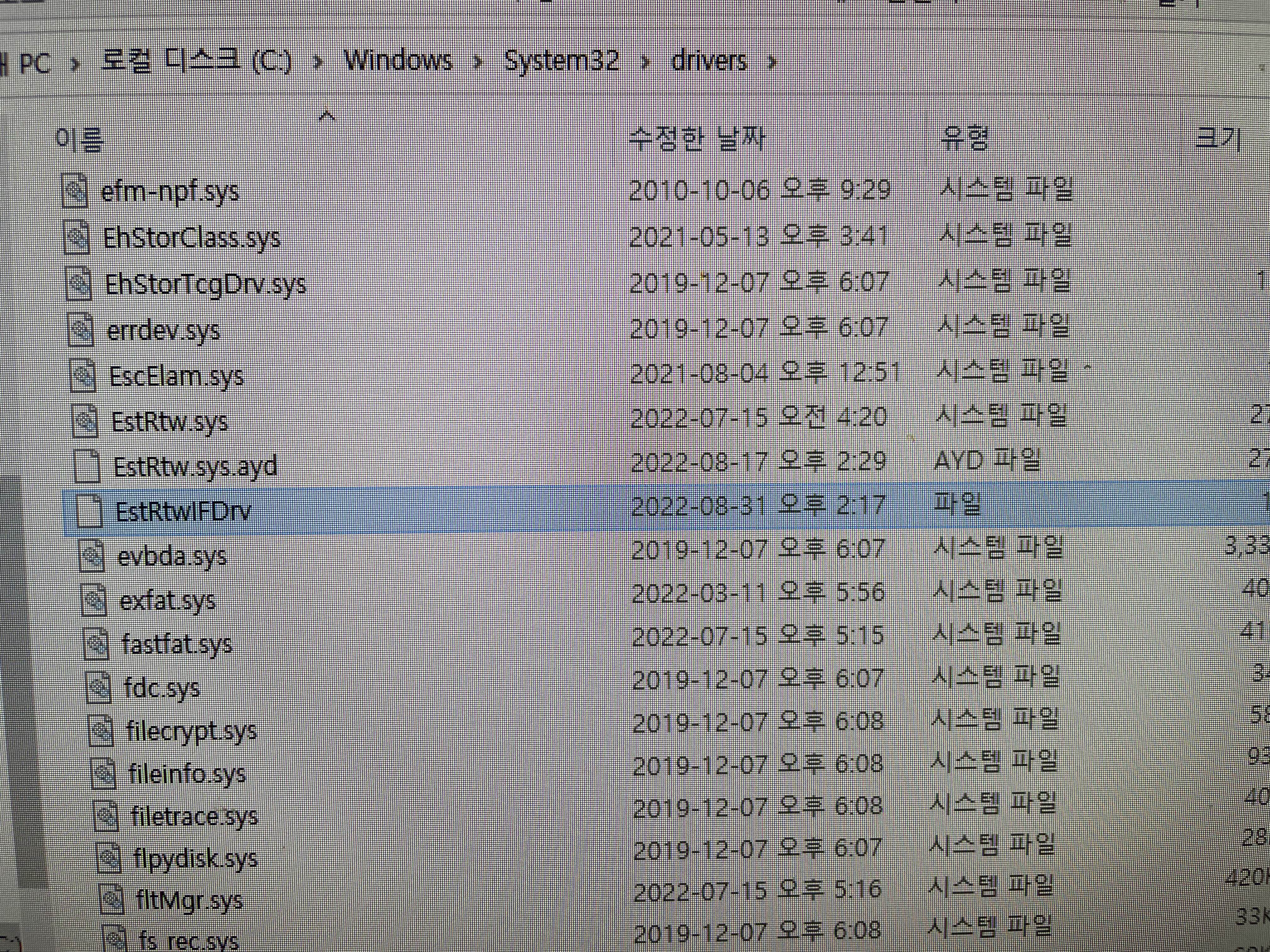 drivers폴더의 ESTRtwIFDrv 파일을 삭제합니다.