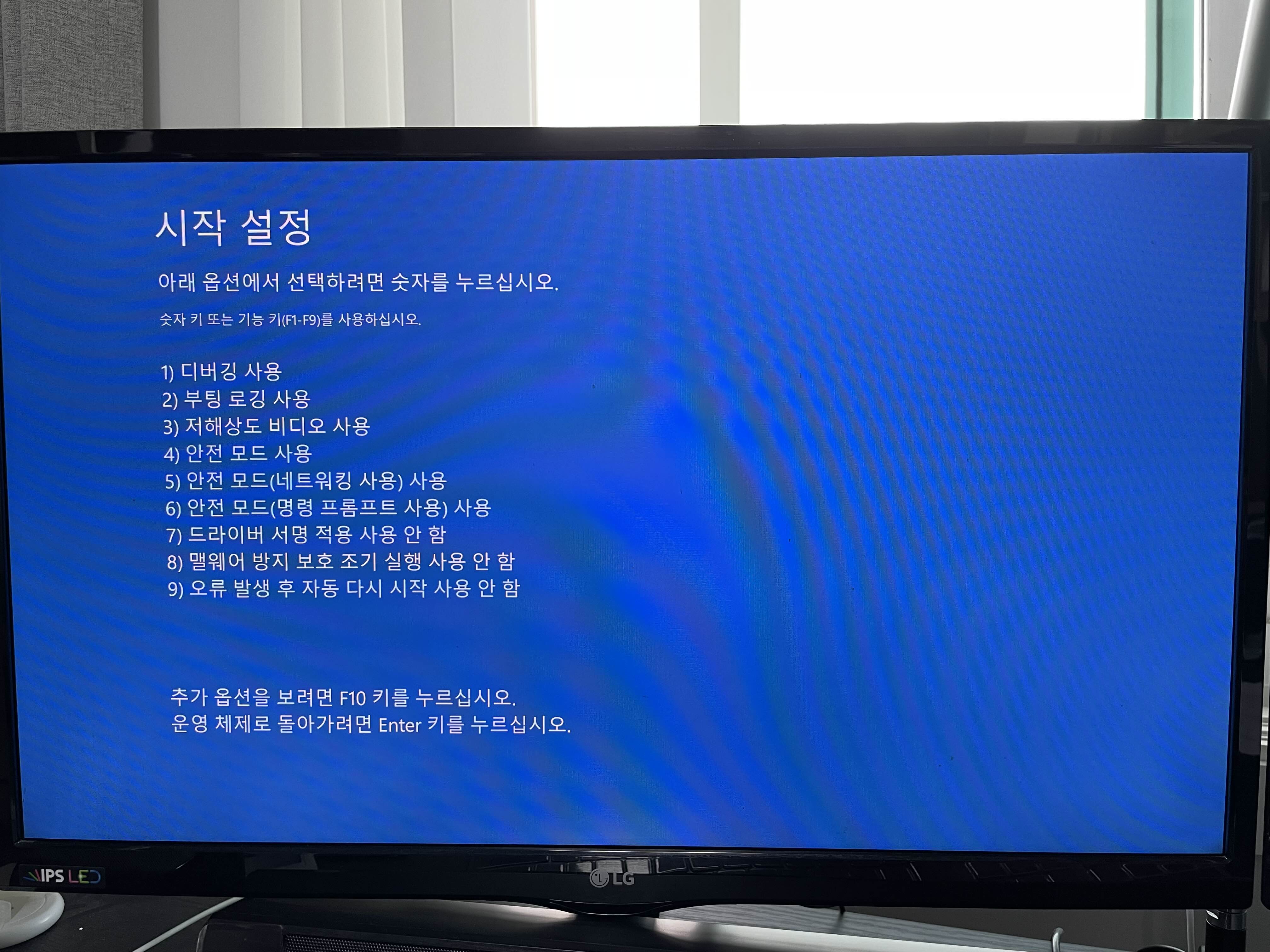 부팅을 하면 아래와 같이 여러가지 시작 설정을 선택할 수 있습니다. 4번 혹은 F4 키로 안전 모드 사용으로 들어갑니다.
