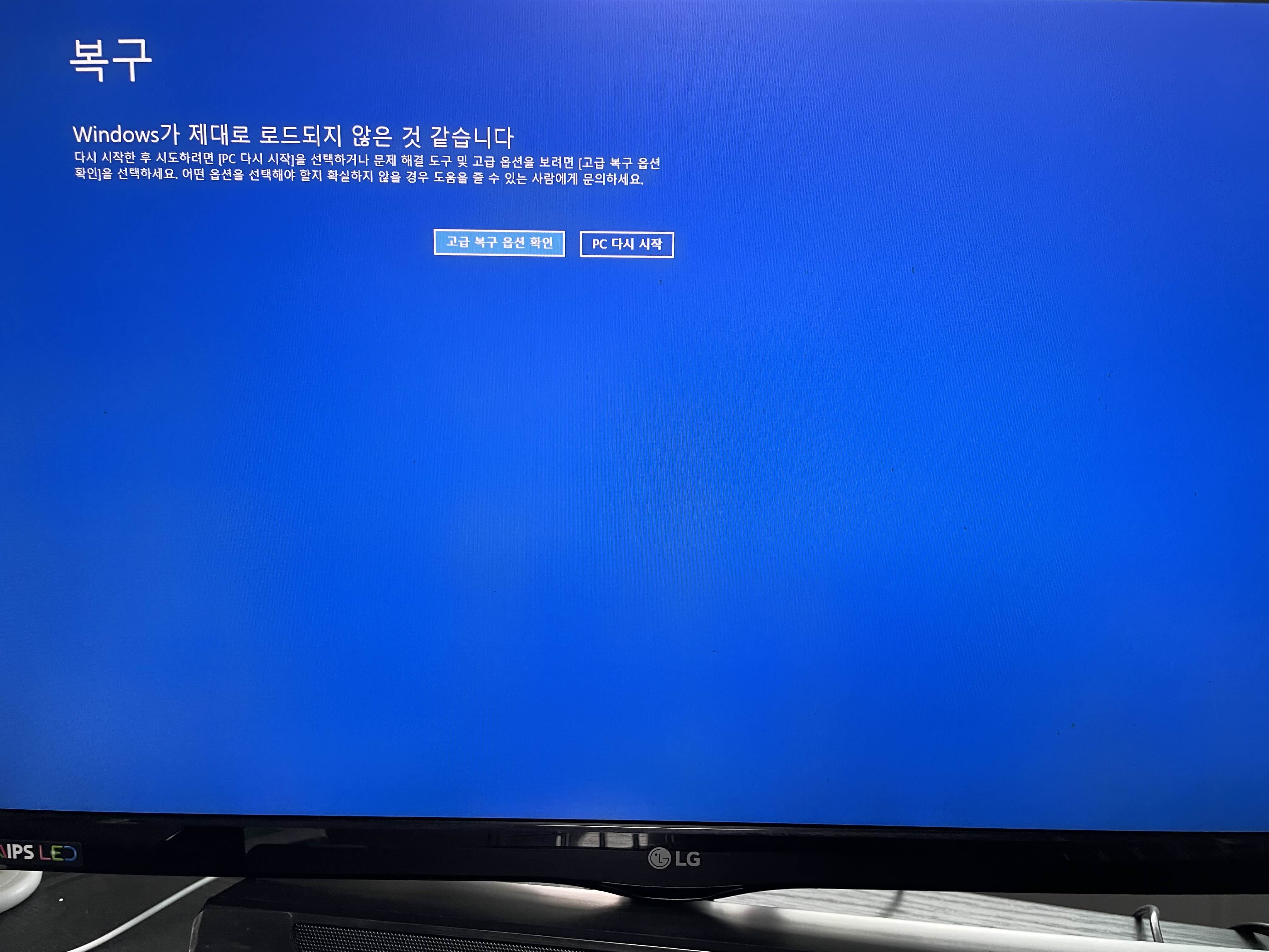 위의 에러 상태는 부팅 후 로그인 비밀번호를 친 직후에 한참 후 다른거 안뜨고 뜬 에러입니다.