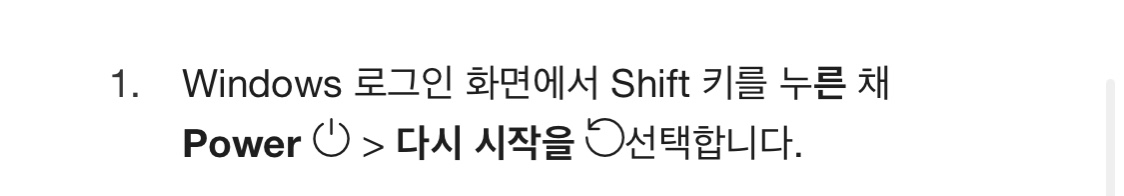 바로 로그인 화면 우측하단에 파워버튼의 다시 시작 버튼을 Shift키와 함께 누르는 것입니다.