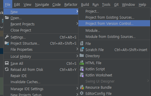 인텔리제이에서 File의 Project from Version Control... 메뉴를 선택합니다.