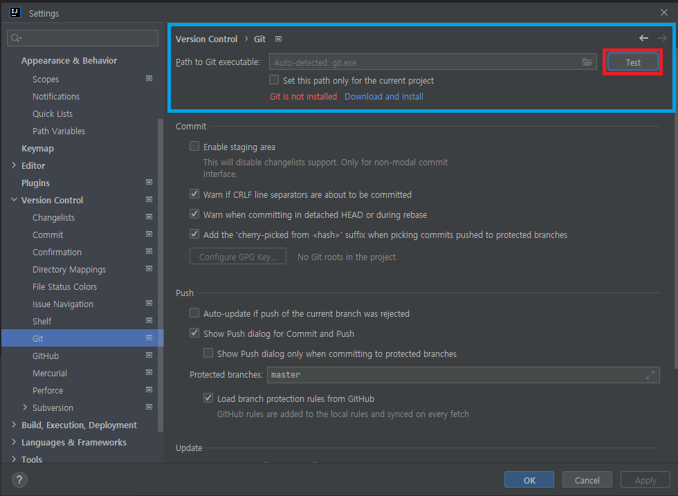 git은 인텔리제이에서 Setting > Version Control > Git 에서 설치되어 있지 않다면 Download and Install 을 누르면 설치가 됩니다.