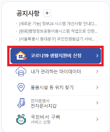 정부24 사이트에 들어가서 로그인을 합니다. 우측 하단에 보면 아래와 같이 코로나19 생활지원비 신청 버튼이 있습니다.