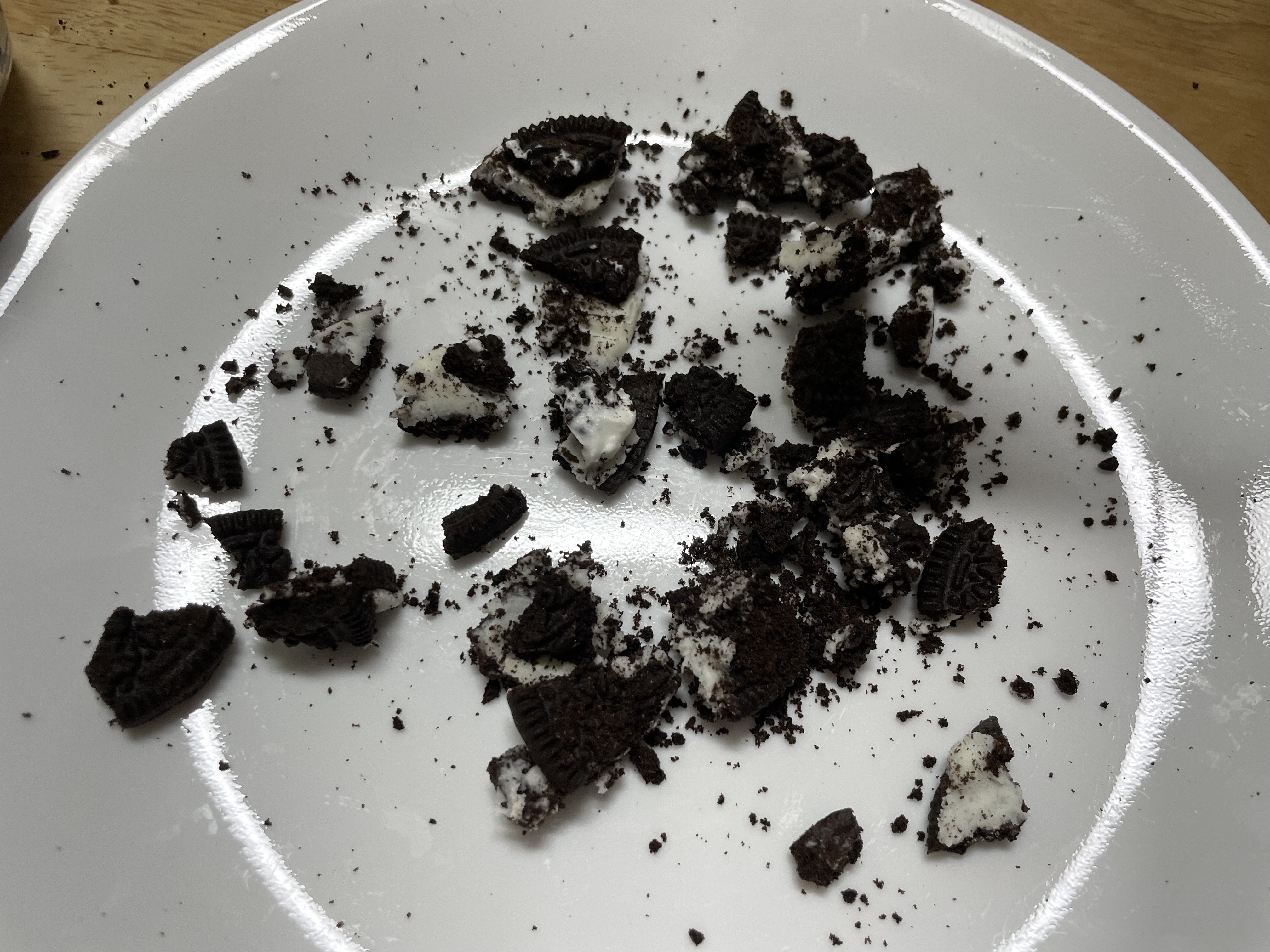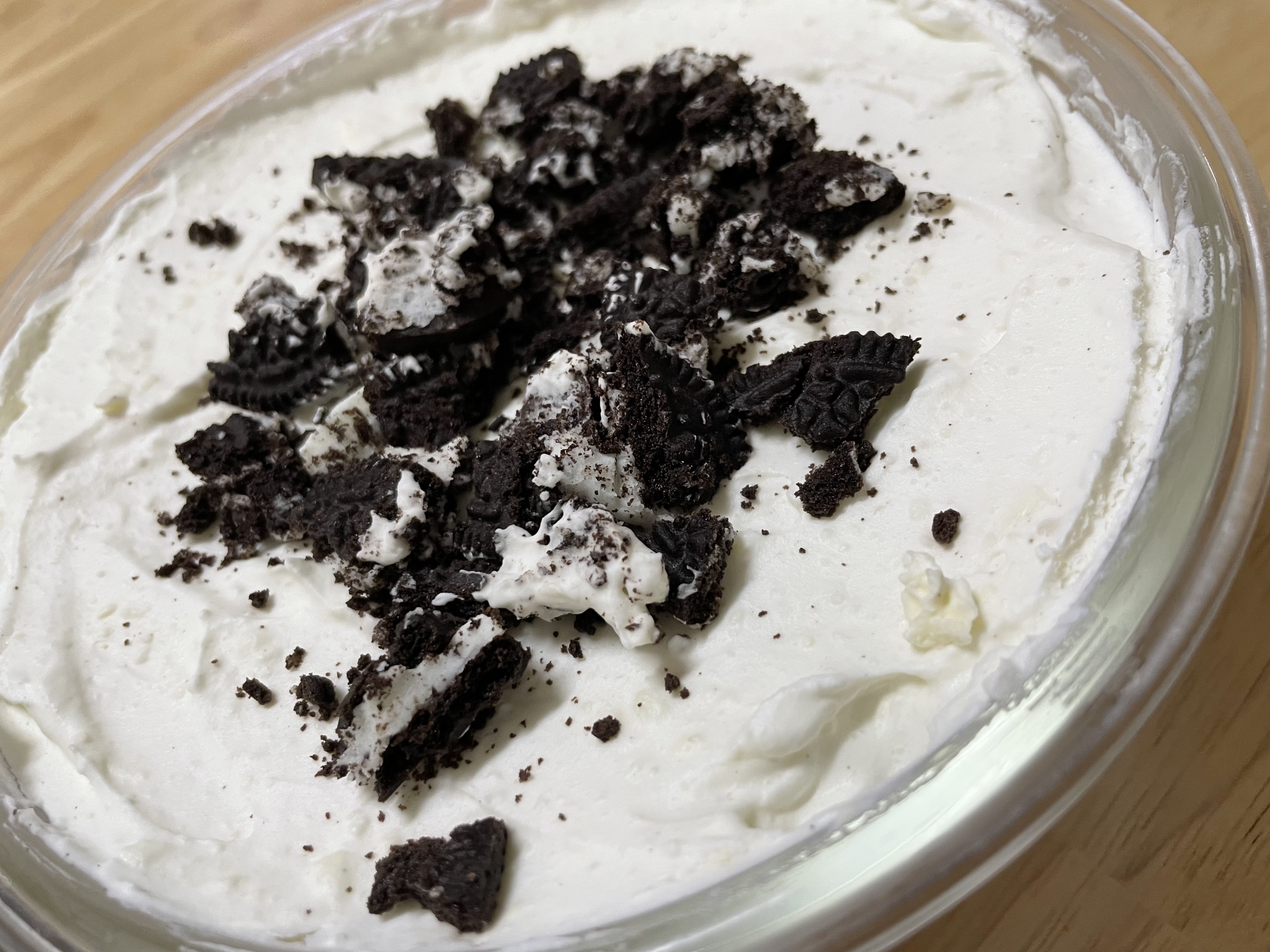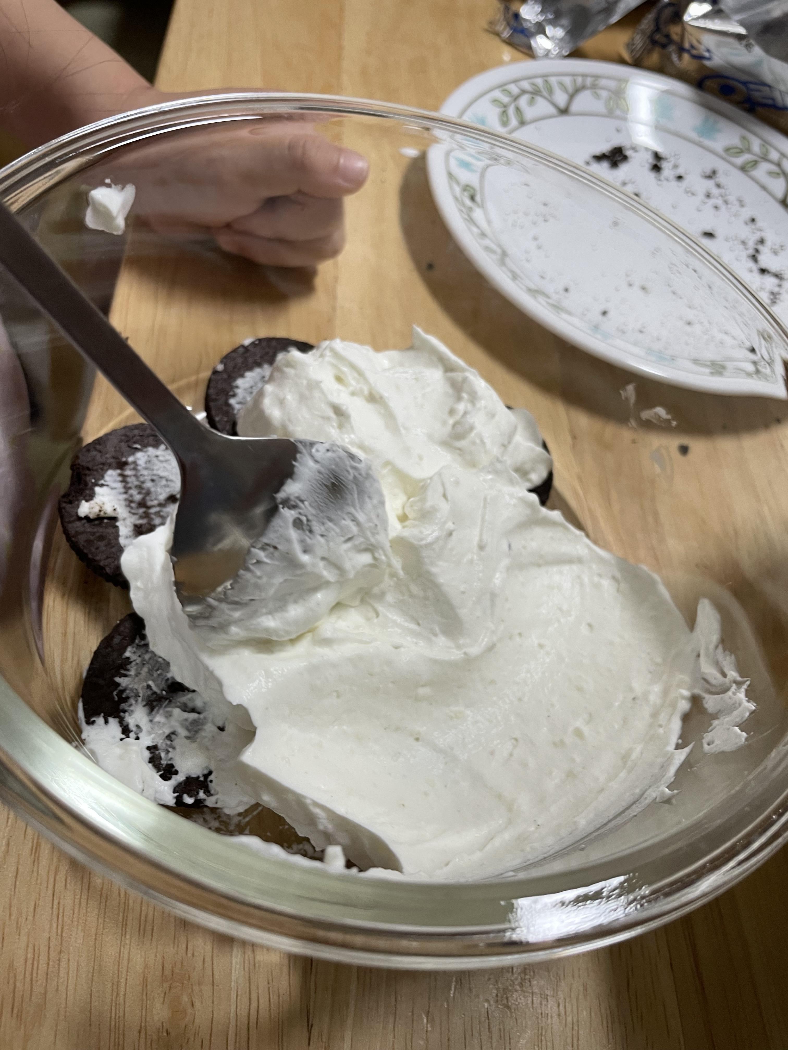마지막에 크림으로 끝나면 뭔가 아쉽겠죠!? 그래서 데코용으로 만들 오레오를 뿌셔뿌셔 가루를 만들어 얹어줍니다.