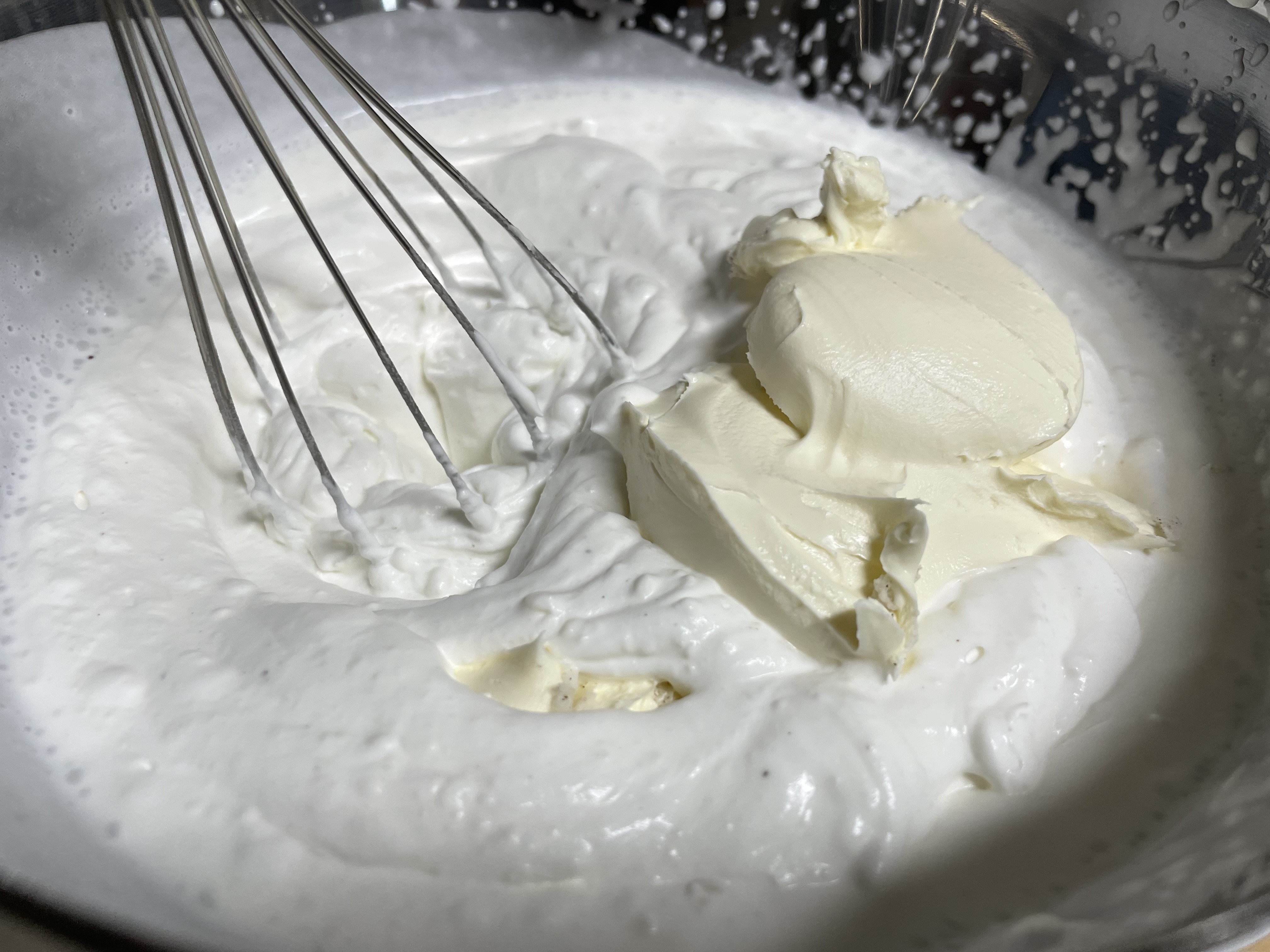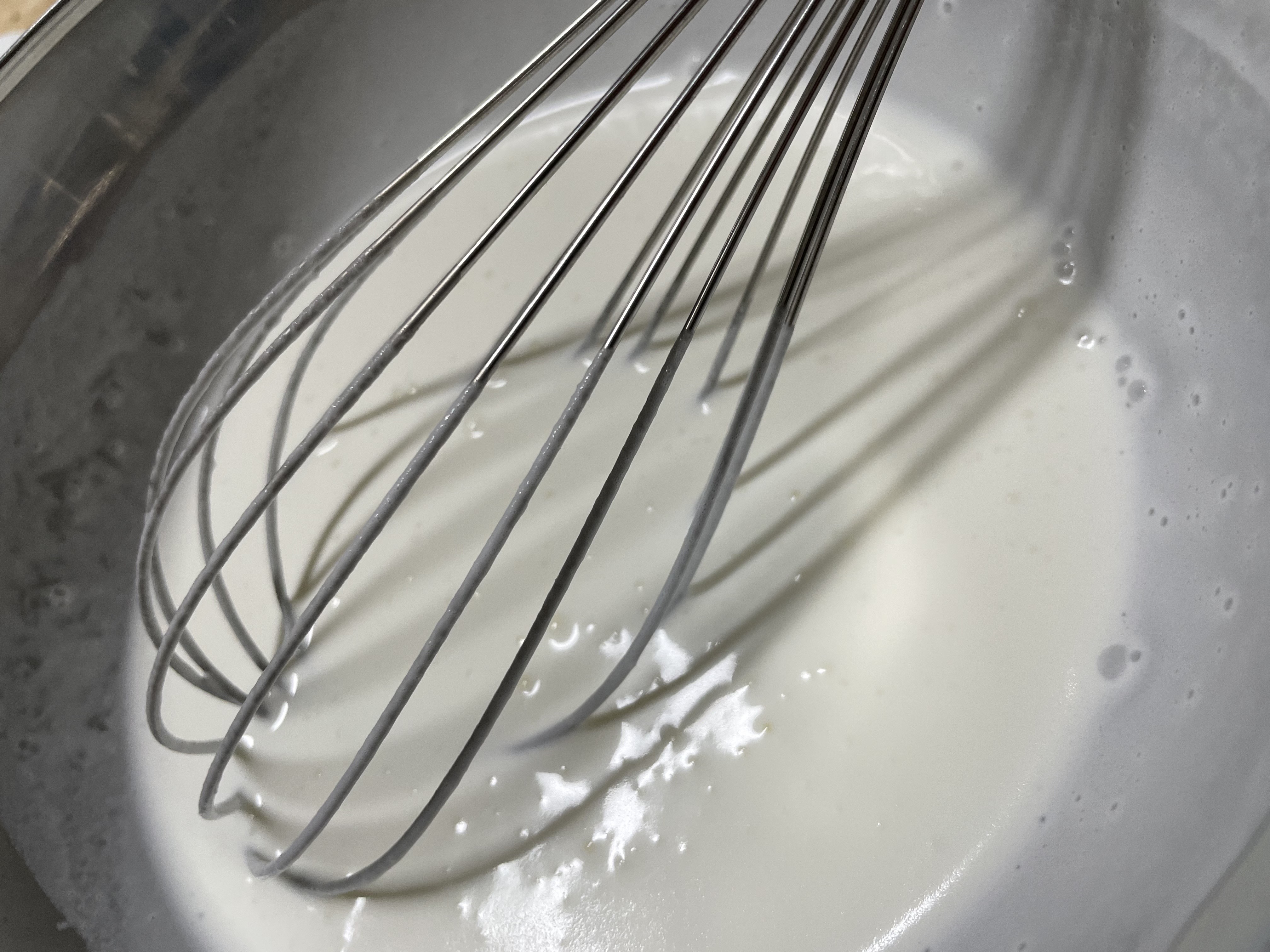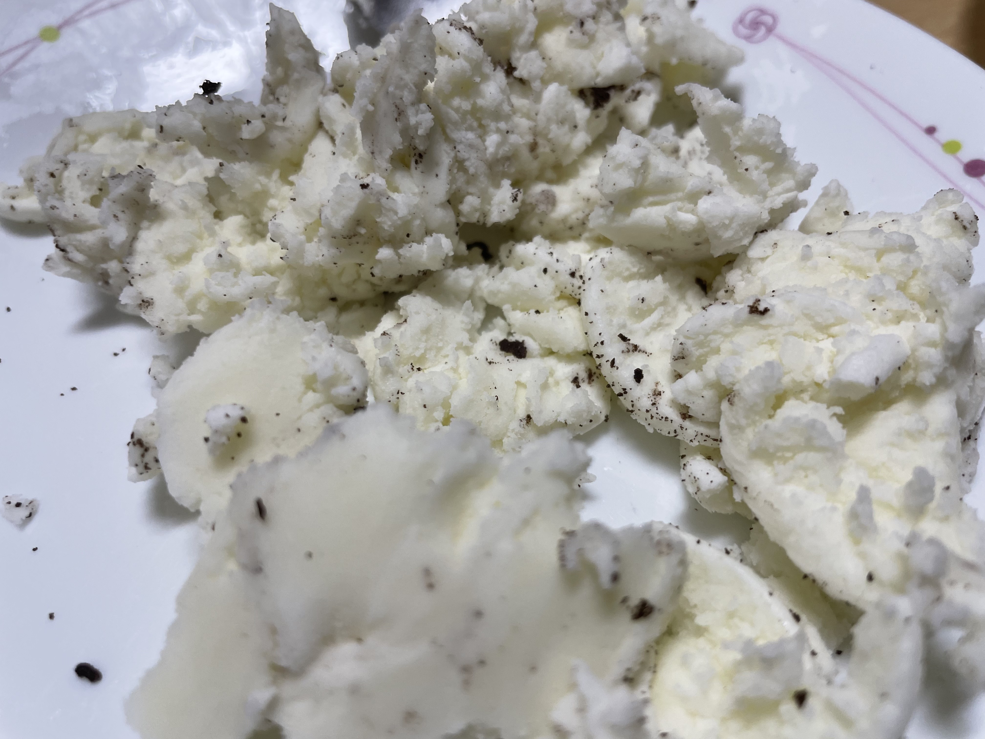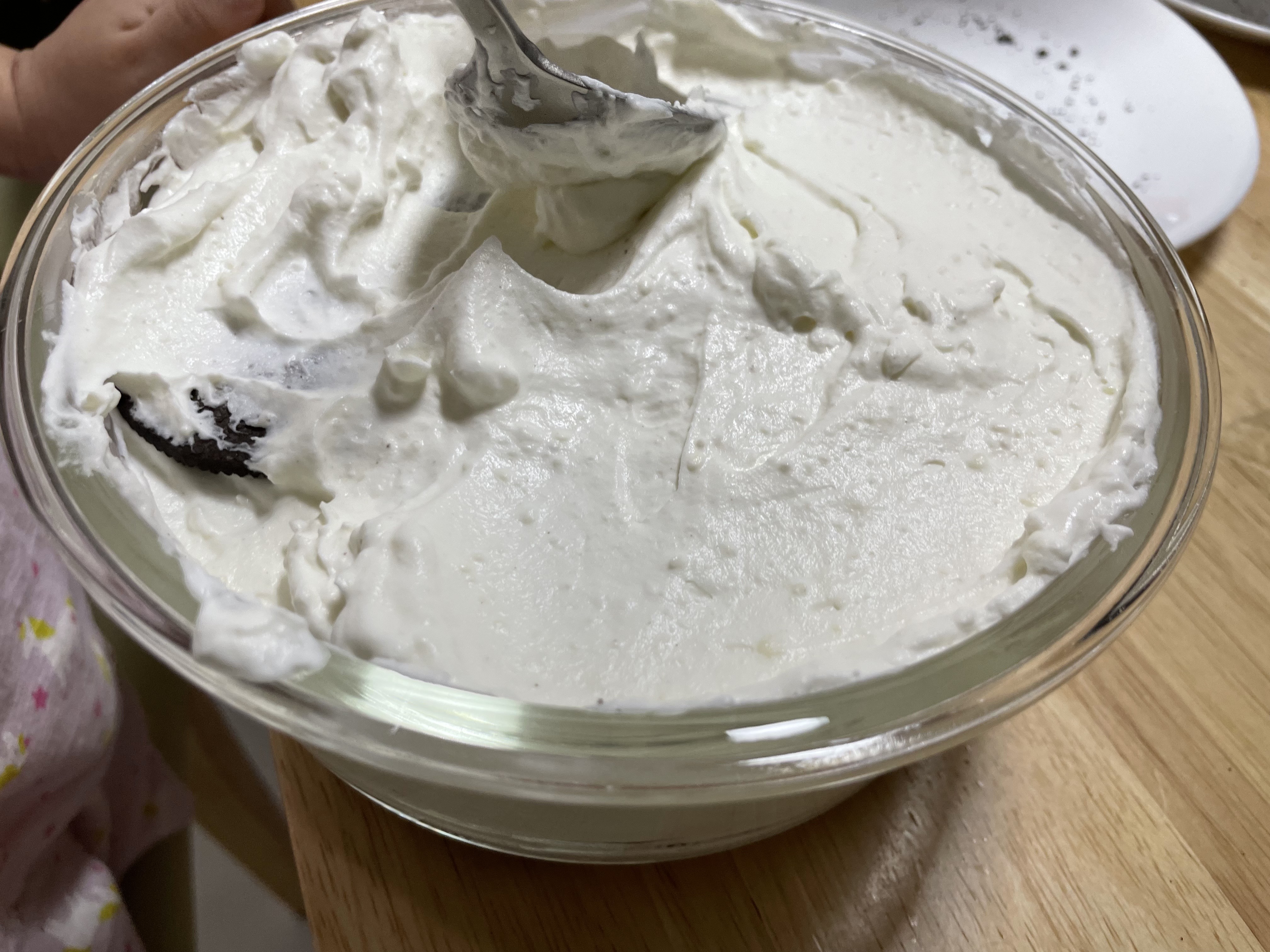 이제야 단단해지기 시작하네요.(걸쭉걸쭉) 이제 여기에 오레오에서 얻은 크림을 넣고 더 섞습니다. 그리고 마지막으로 크림치즈까지 넣어서 섞으면 끝!!(추가로 설탕 1스푼 정도 넣으면 달달함의 완성)