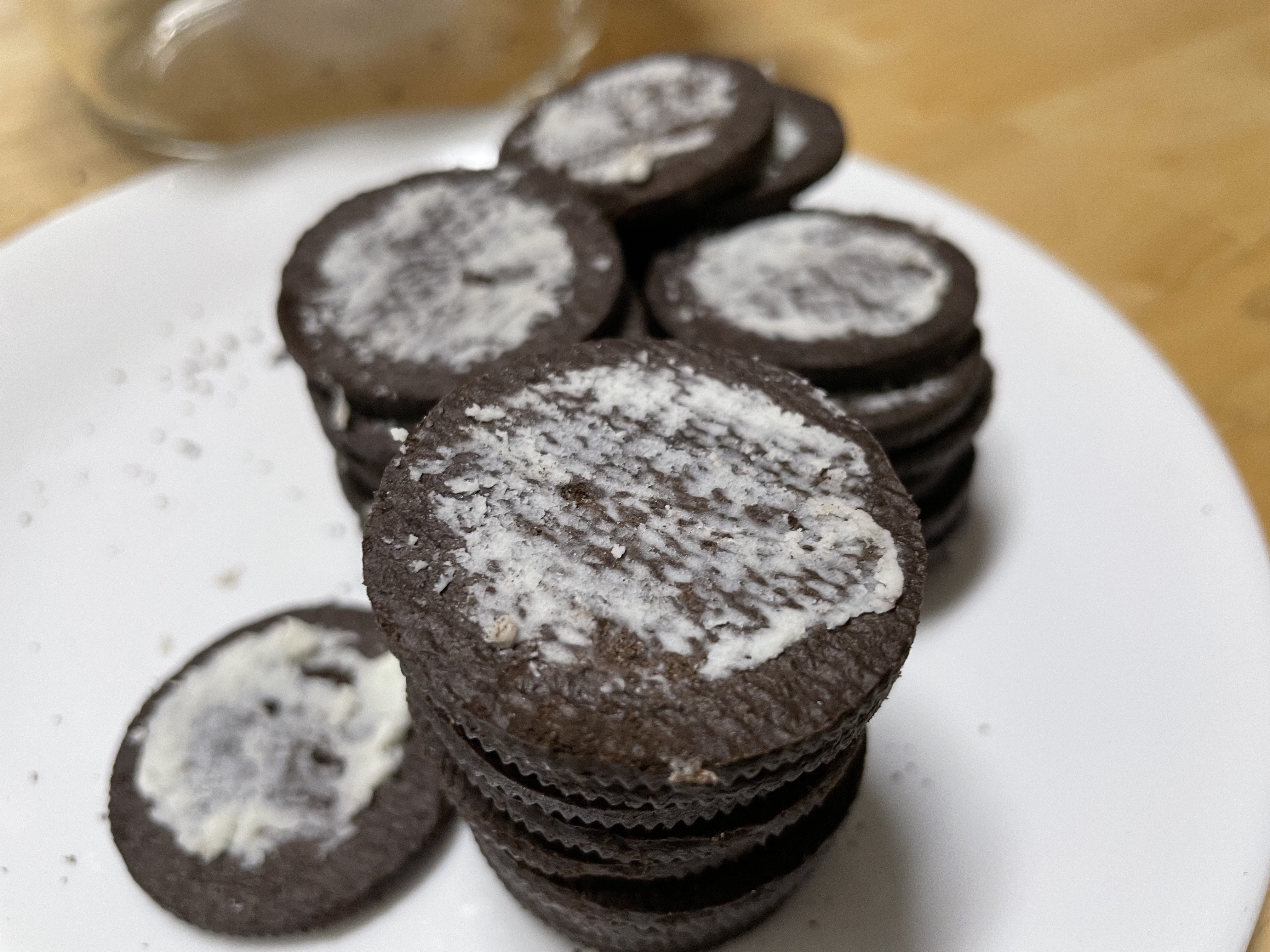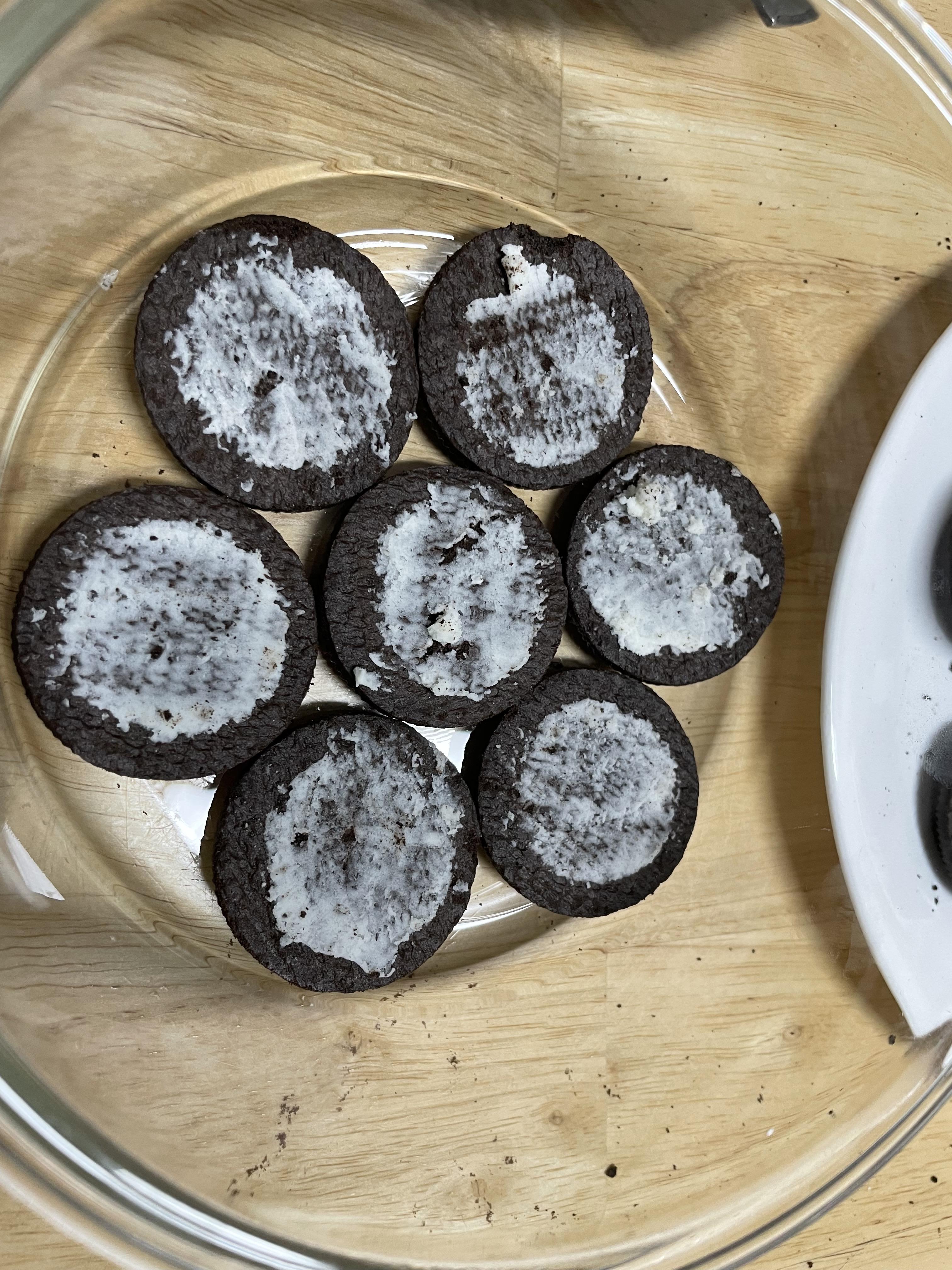 첫번째로 오레오 과자를 뜯어야겠죠!? 그리고 나서 반을 갈라 안의 크림과 과자를 분리해줍니다.