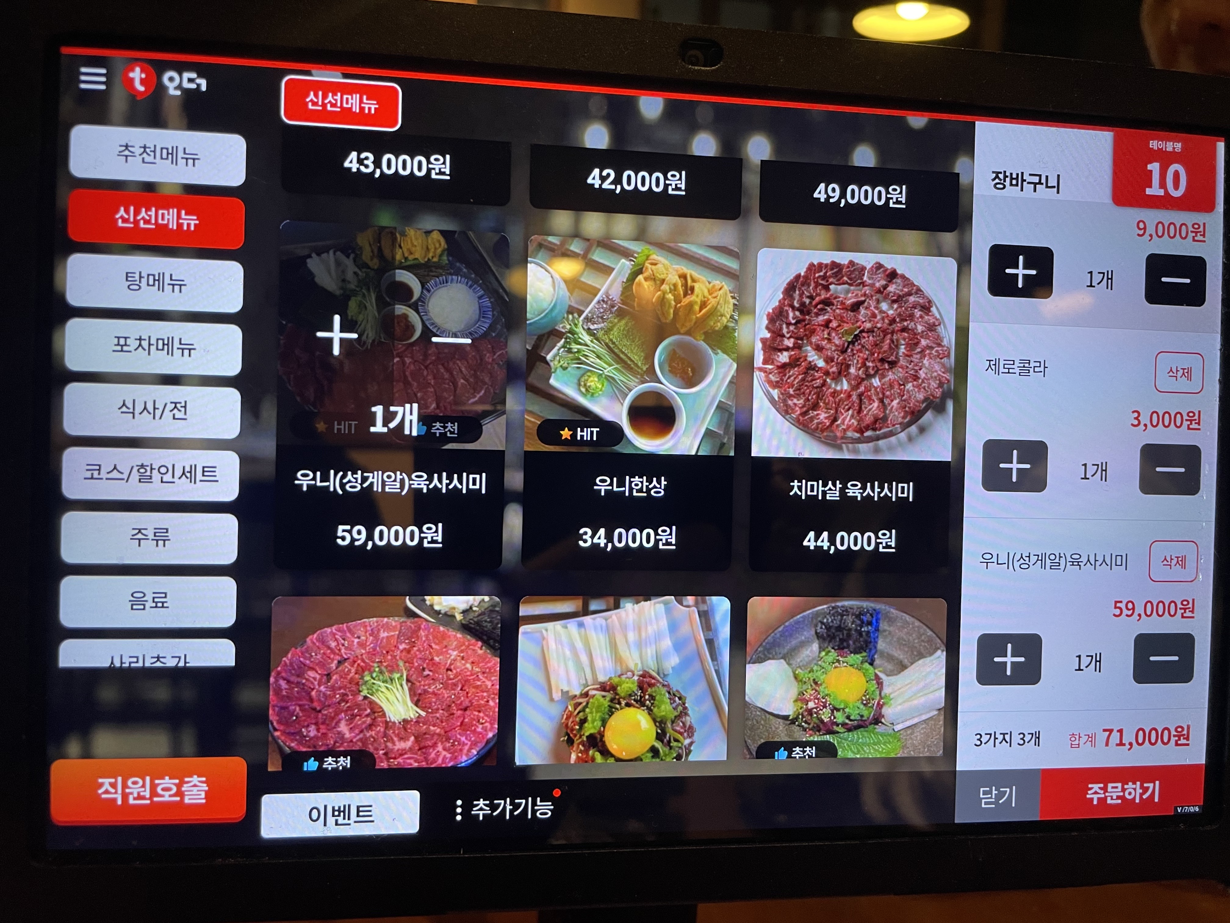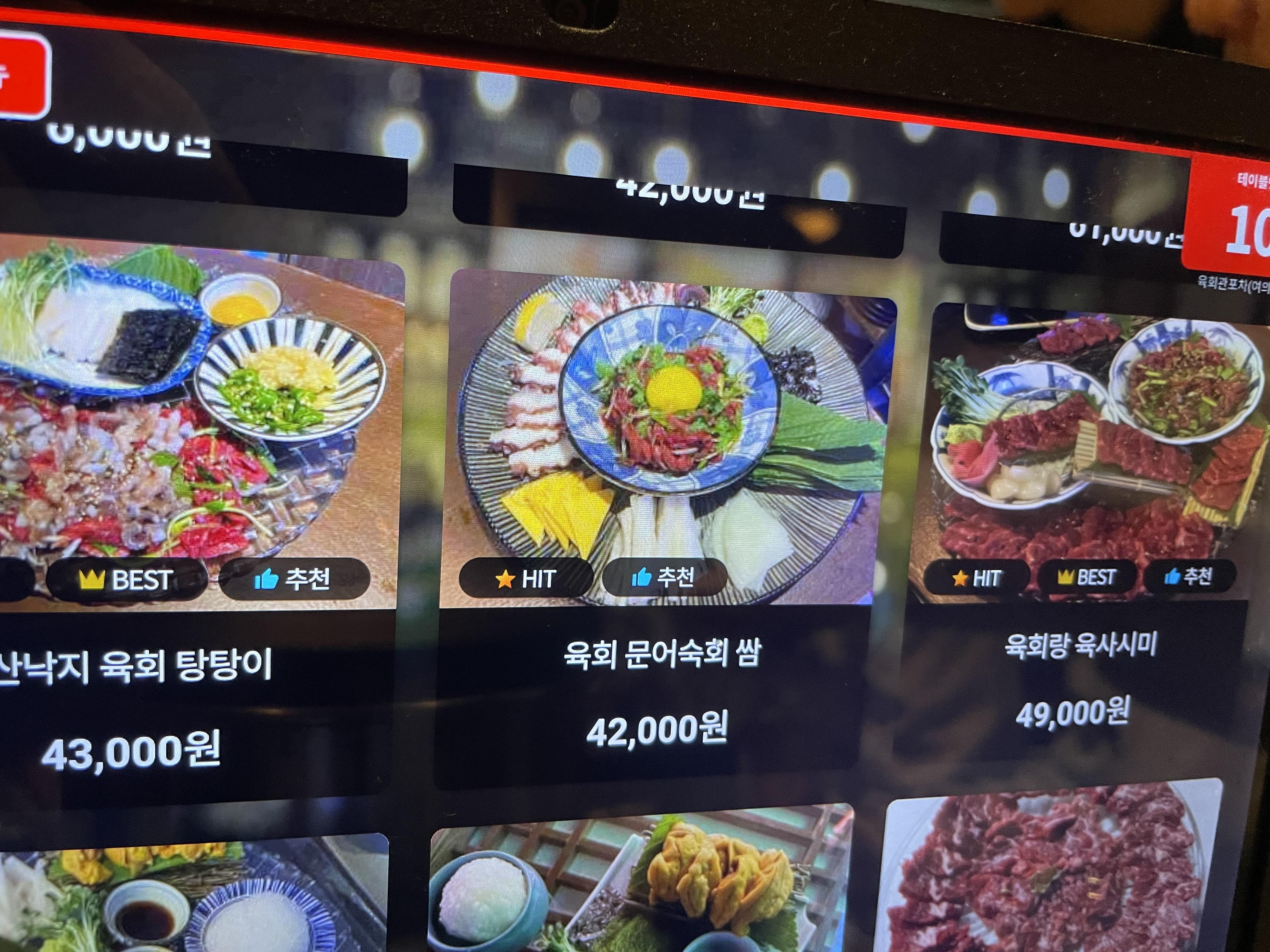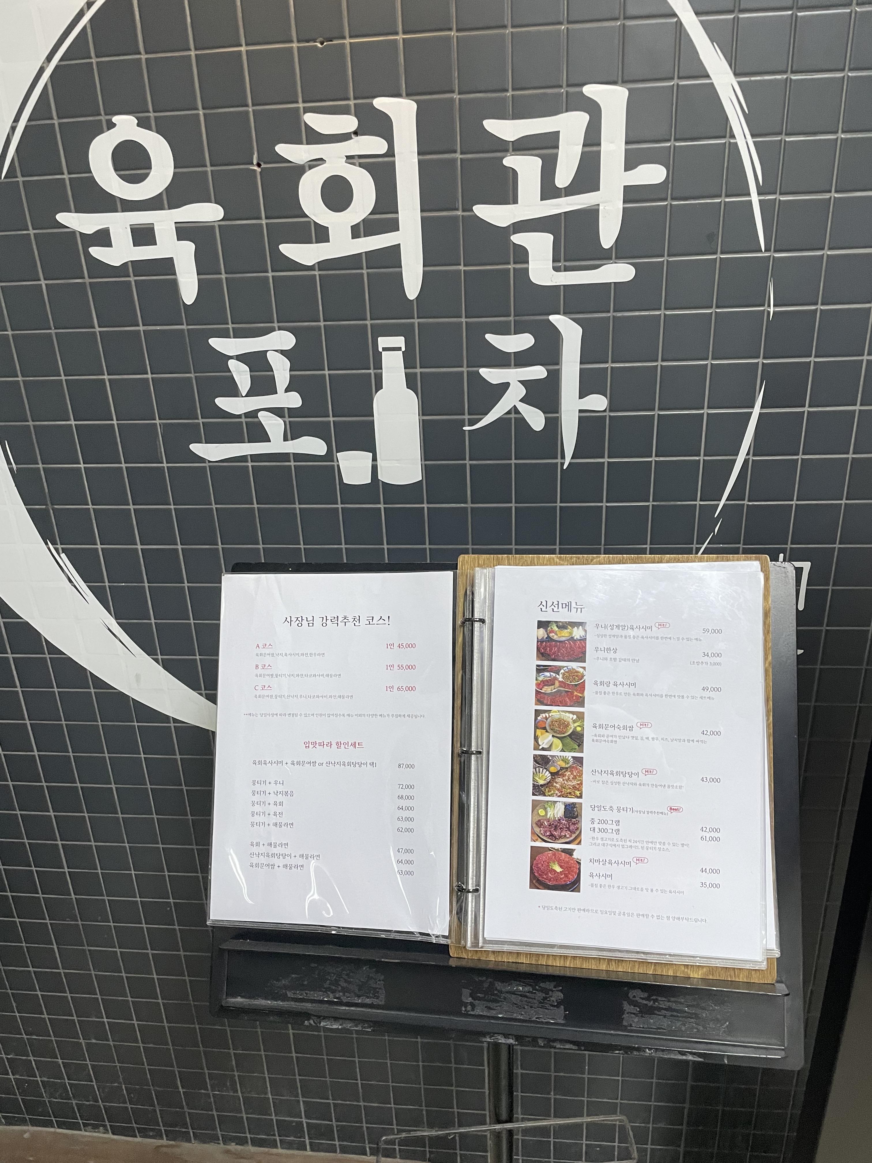 음식으로 시킨건 육회문어숙회 쌈과, 육회랑 육사시미, 우니(성게알)육사시미가 되겠습니다!