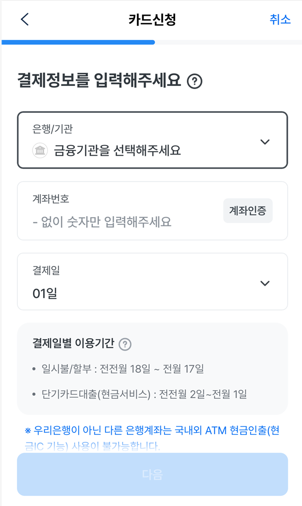 아래는 제가 우리체크카드로 신청한 예시입니다.