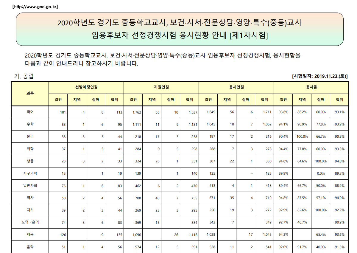 | 2020학년도 중등임용시험 응시원서 접수현황(최종) - 서울, 경기, 인천 (0) | 2019.11.18 |