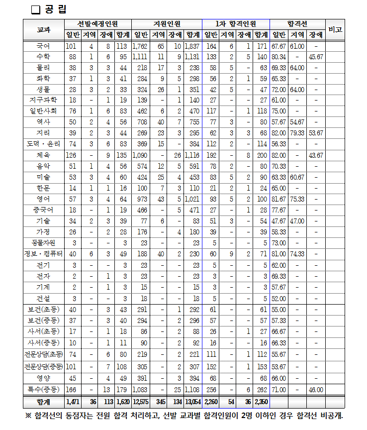 2020학년도 중등교사 임용시험 1차시험 합격선