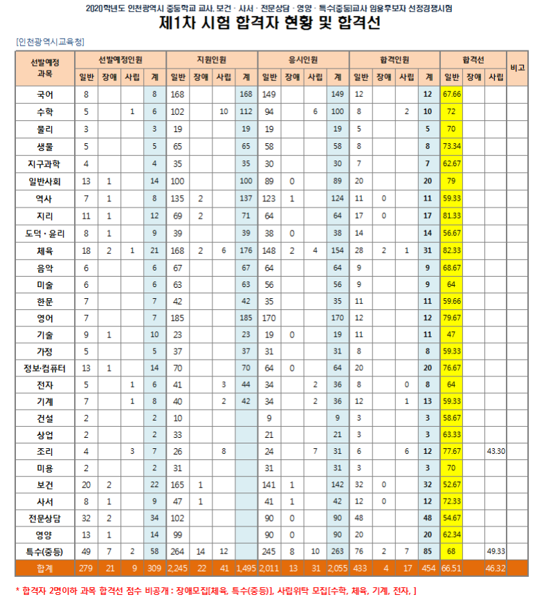 2020학년도 중등교사 1차시험 합격선(커트라인) - 서울, 경기, 인천, 부산