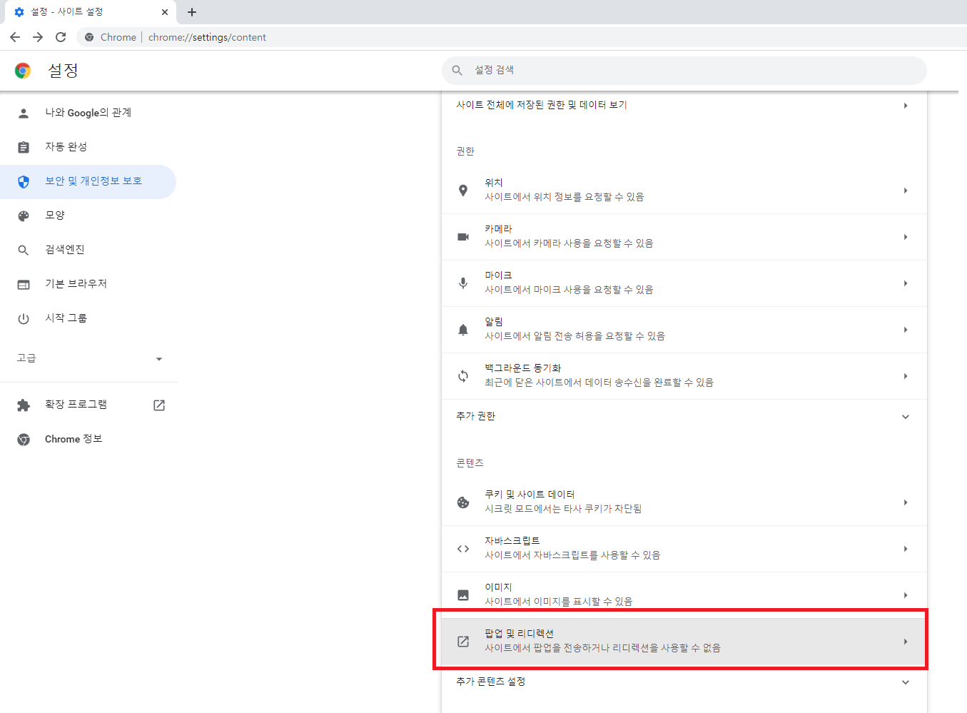 맨 마지막의 콘텐츠 영역을 보면 팝업 및 리디렉션 이라는 항목이 있습니다.