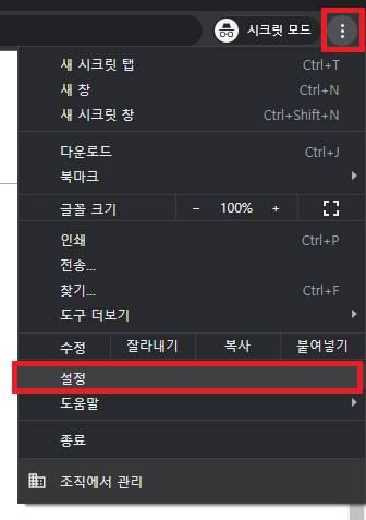 크롬을 띄우면 오른쪽 끝에 점세개가 있습니다.