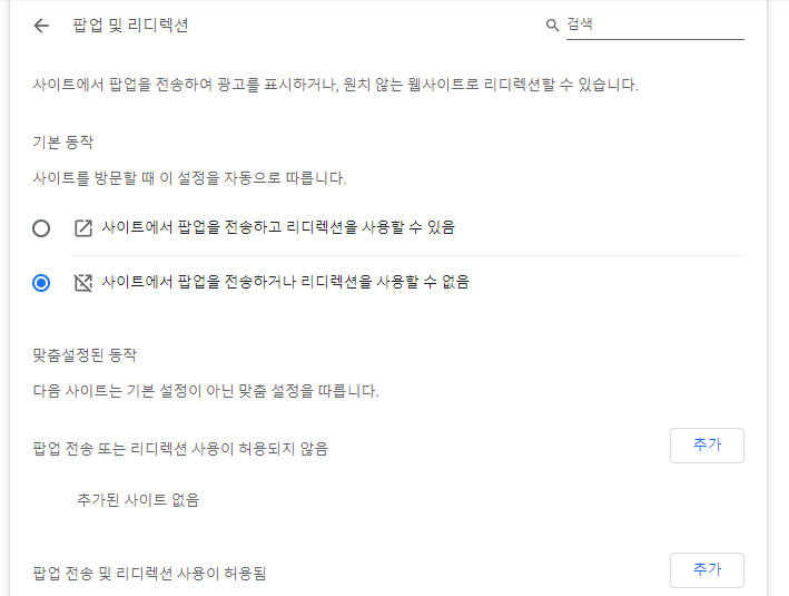 맨 마지막의 콘텐츠 영역을 보면 팝업 및 리디렉션 이라는 항목이 있습니다.