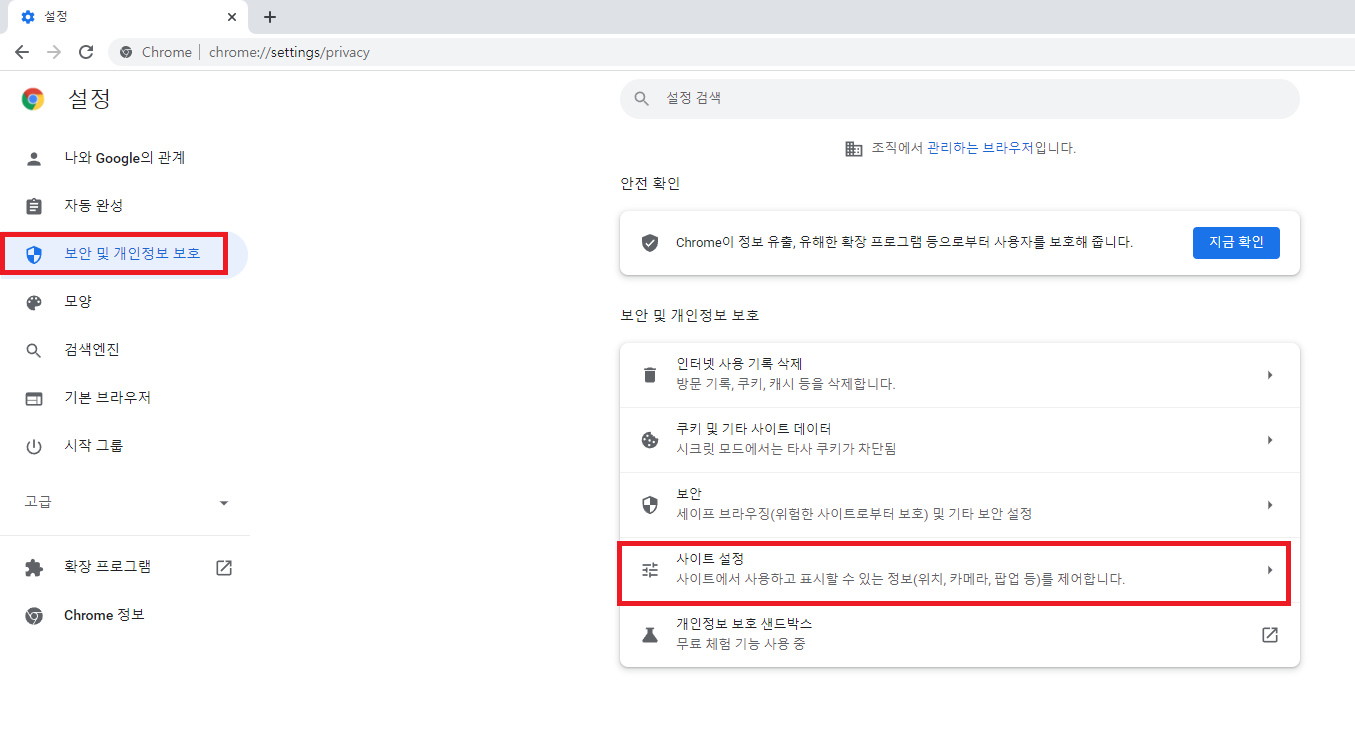 다음으로는 보안 및 개인정보 보호 탭으로 들어가서 사이트 설정을 누릅니다.