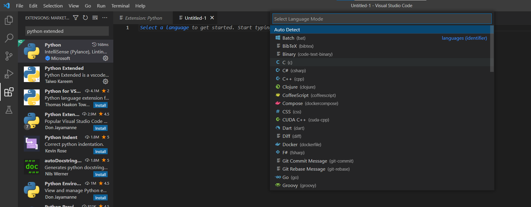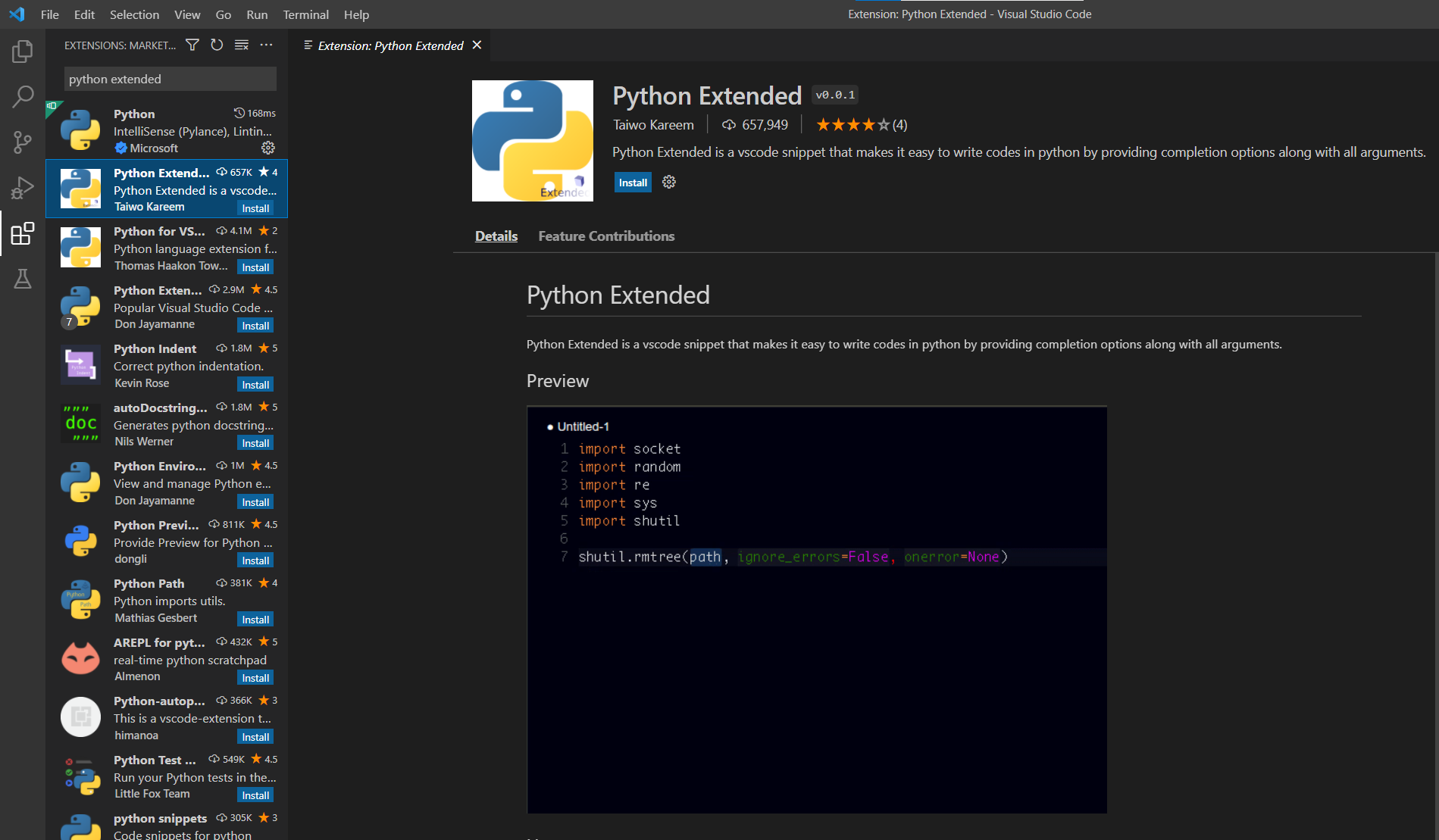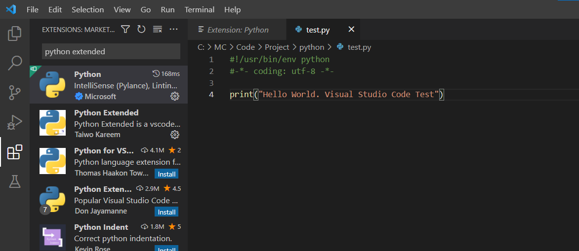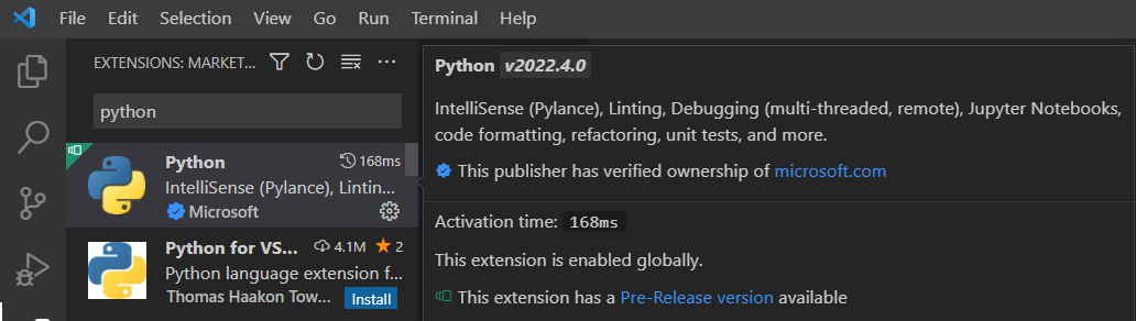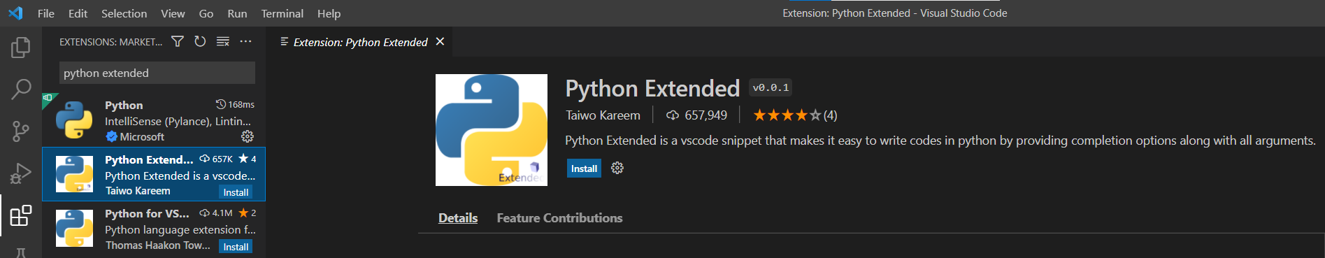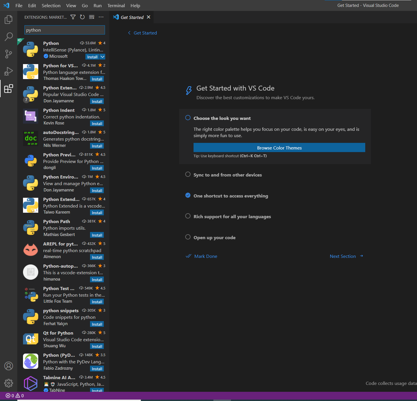 먼저 파이썬을 써야하니 설치해보도록 하죠. python을 검색하면 이와 관련된 Extensions가 쭉 나열됩니다.