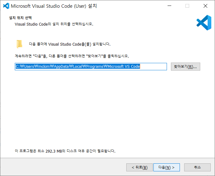 설치할 위치를 표시해주는데, 바꿔도 되고 바꾸지 않고 그대로 사용해도 됩니다. "이 프로그램은 최소 292.3MB의 디스크 여유 공간이 필요합니다." 라고 문구가 있으므로 용량은 여유롭게 가지고 있는게 좋겠죠?