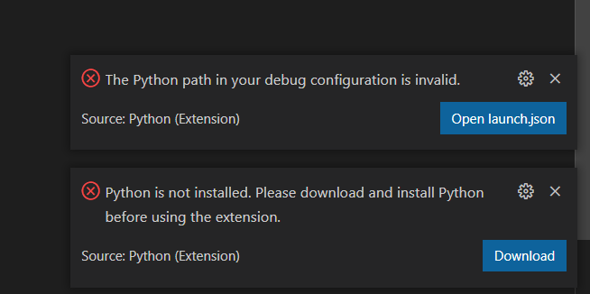 F5를 누르면 실행이 되어야하는데 두둥.. 아래와 같이 에러가 뜨죠. 잘 읽어보면 이해가 됩니다. Python is not installed. 파이썬이 설치되어 있지 않다는 것인데요. 파이썬은 따로 깔아서 환경설정해줘야합니다.