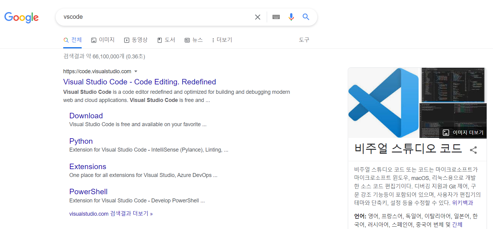 설치는 구글에서 vscode를 검색하면 Visual Studio Code가 나타납니다.
