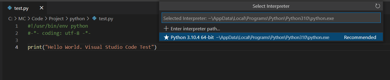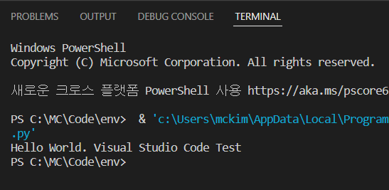 이제 저 Interpreter를 선택해주고 F5를 누르면 터미널에 출력되는 것을 확인해 볼 수 있습니다.