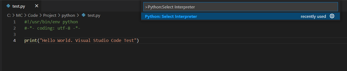 다시 돌아와서 파일, Command Palette... 를 눌러서 Python: Select Interpreter 를 입력합니다.